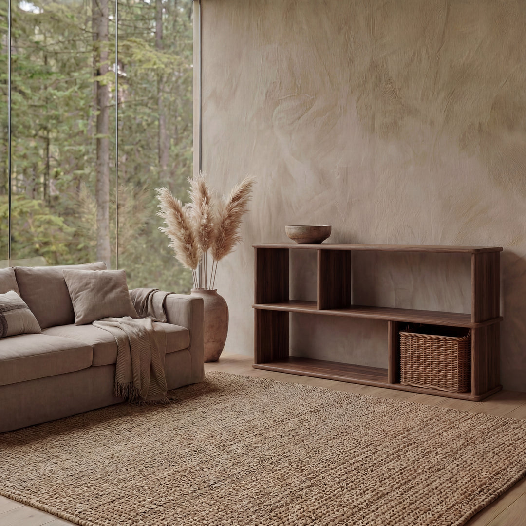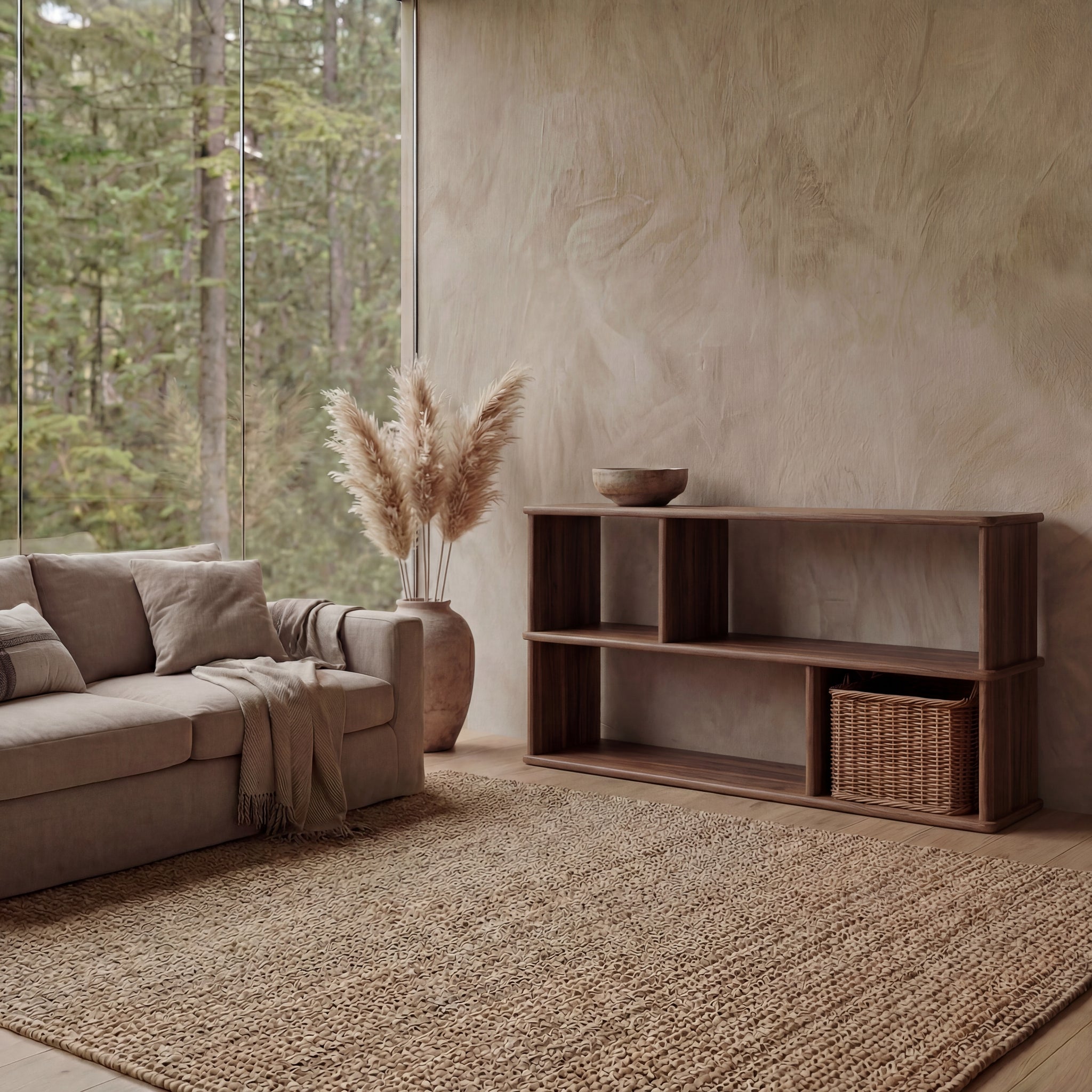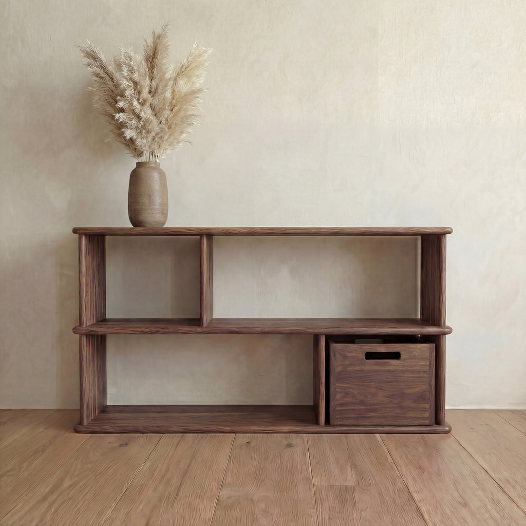 A low horizontal bookshelf in solid walnut, built by hand in Vancouver, BC