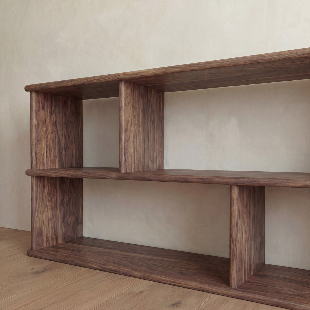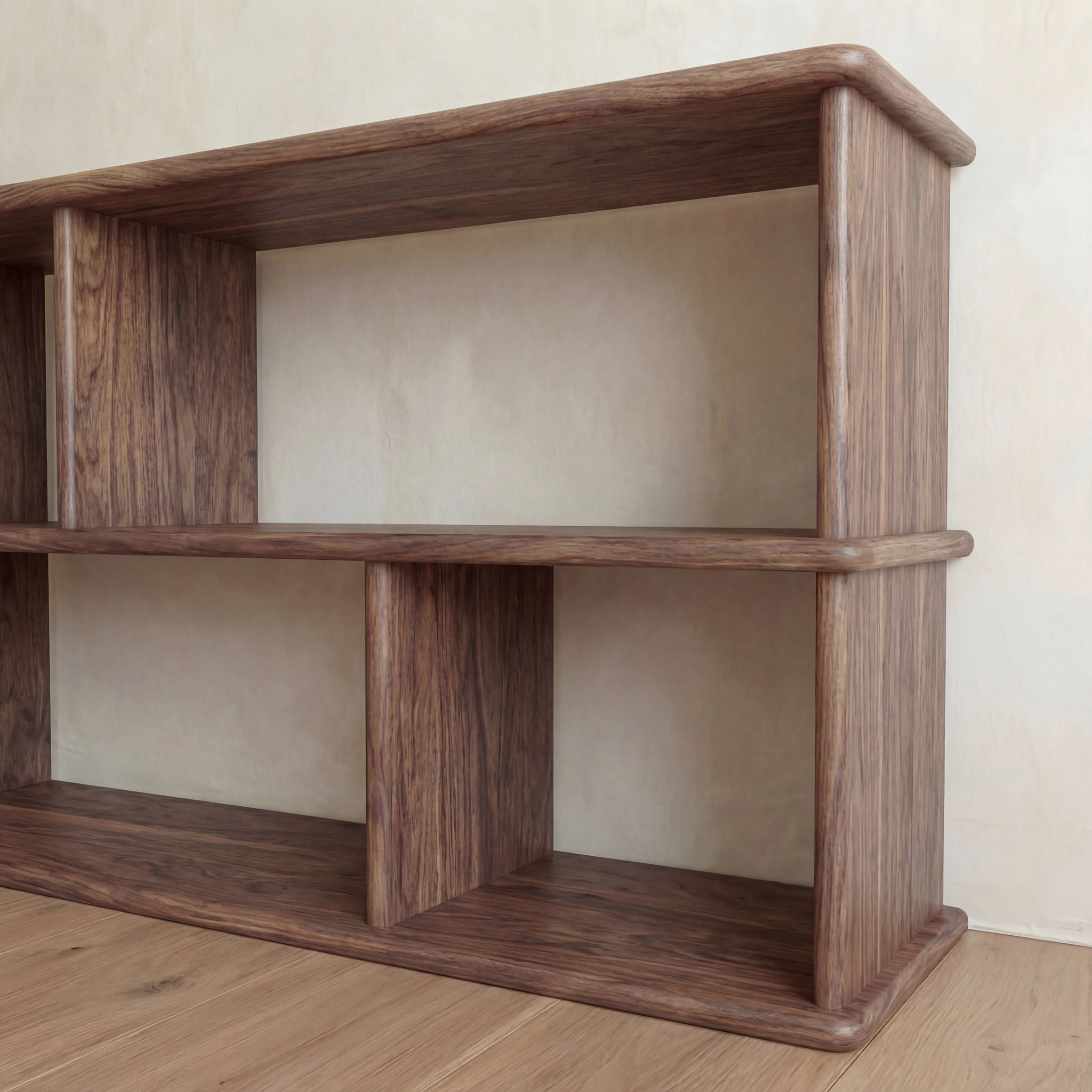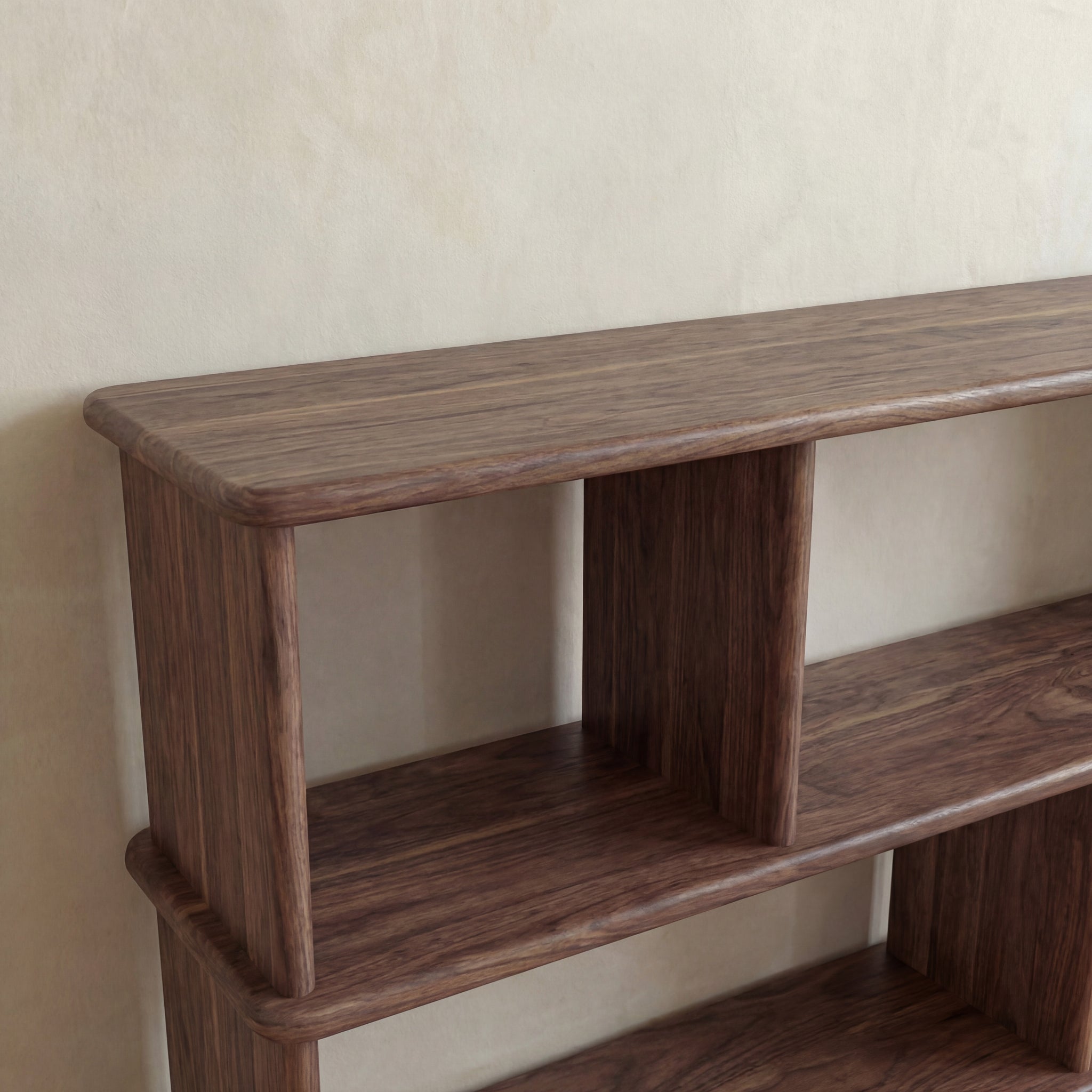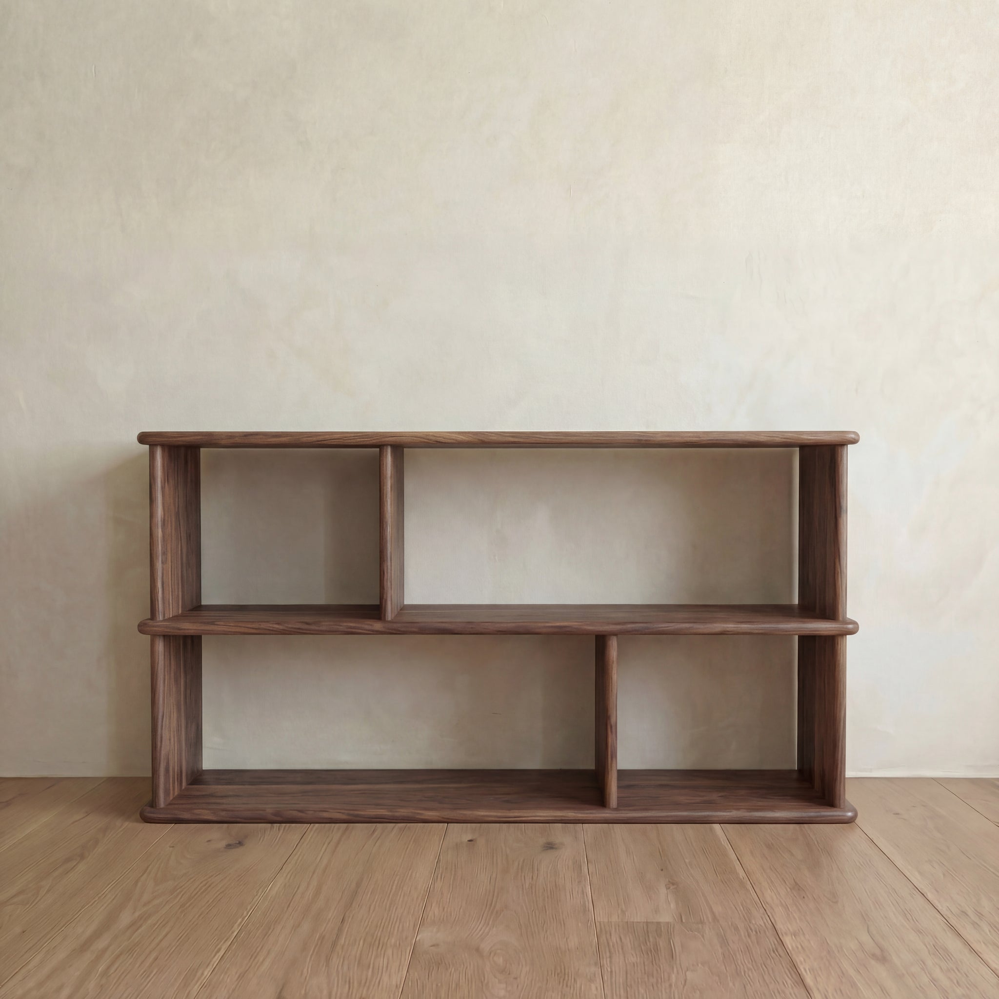 The horizontal bookshelf is made entirely out of solid, kiln dried walnut, finished with a non-toxic hard wax oil to highlight the wood's natural colour and rounded over subtly to soften all of the edges.