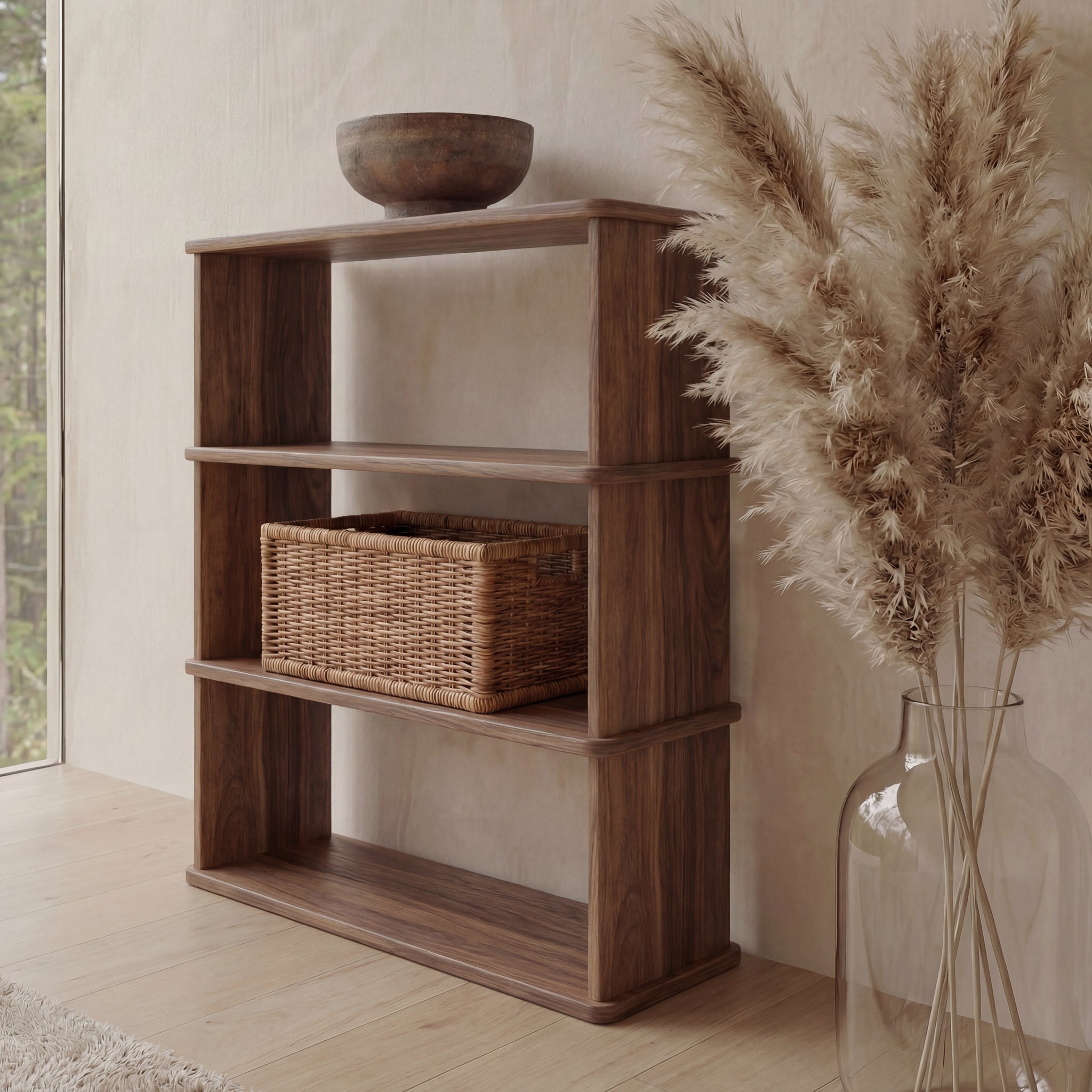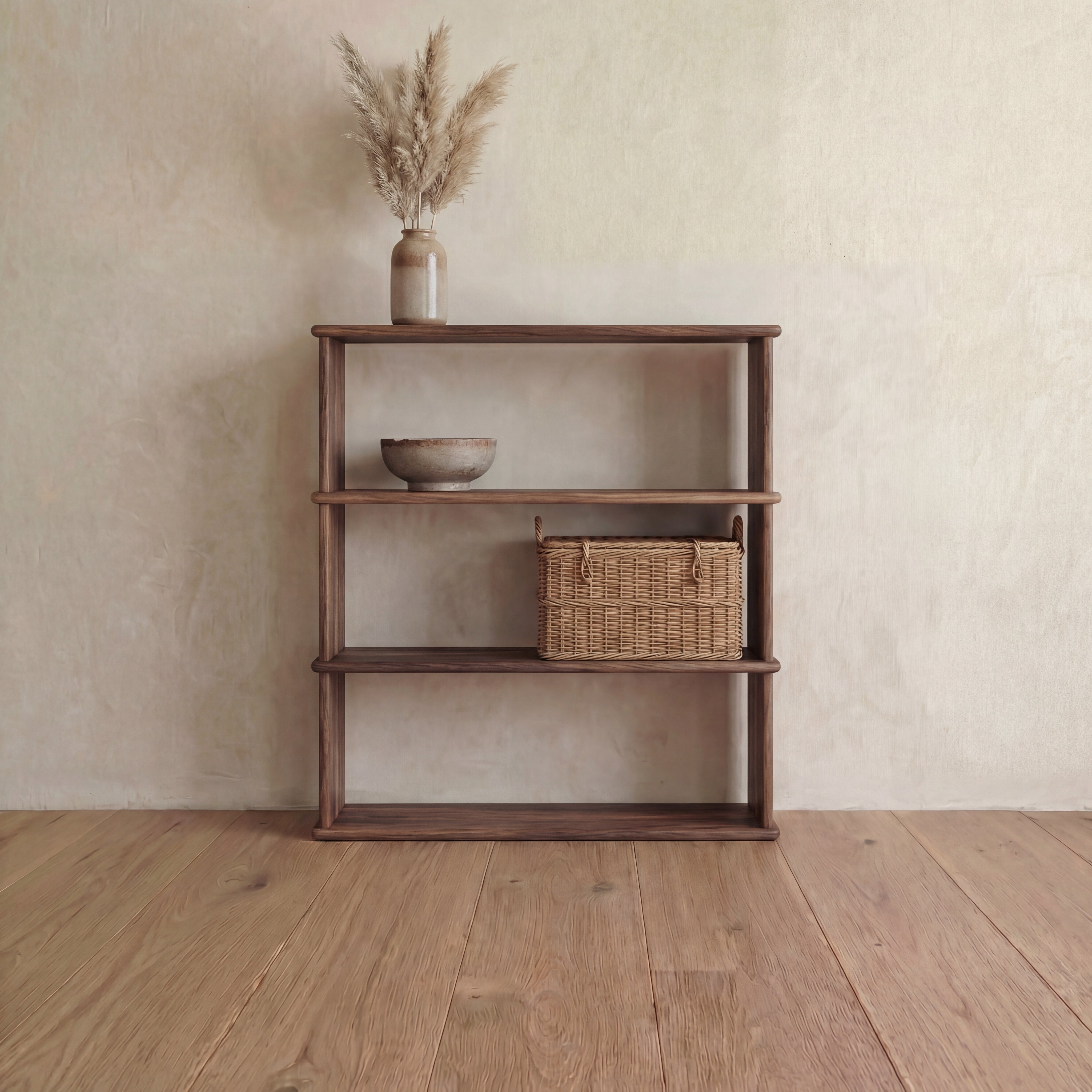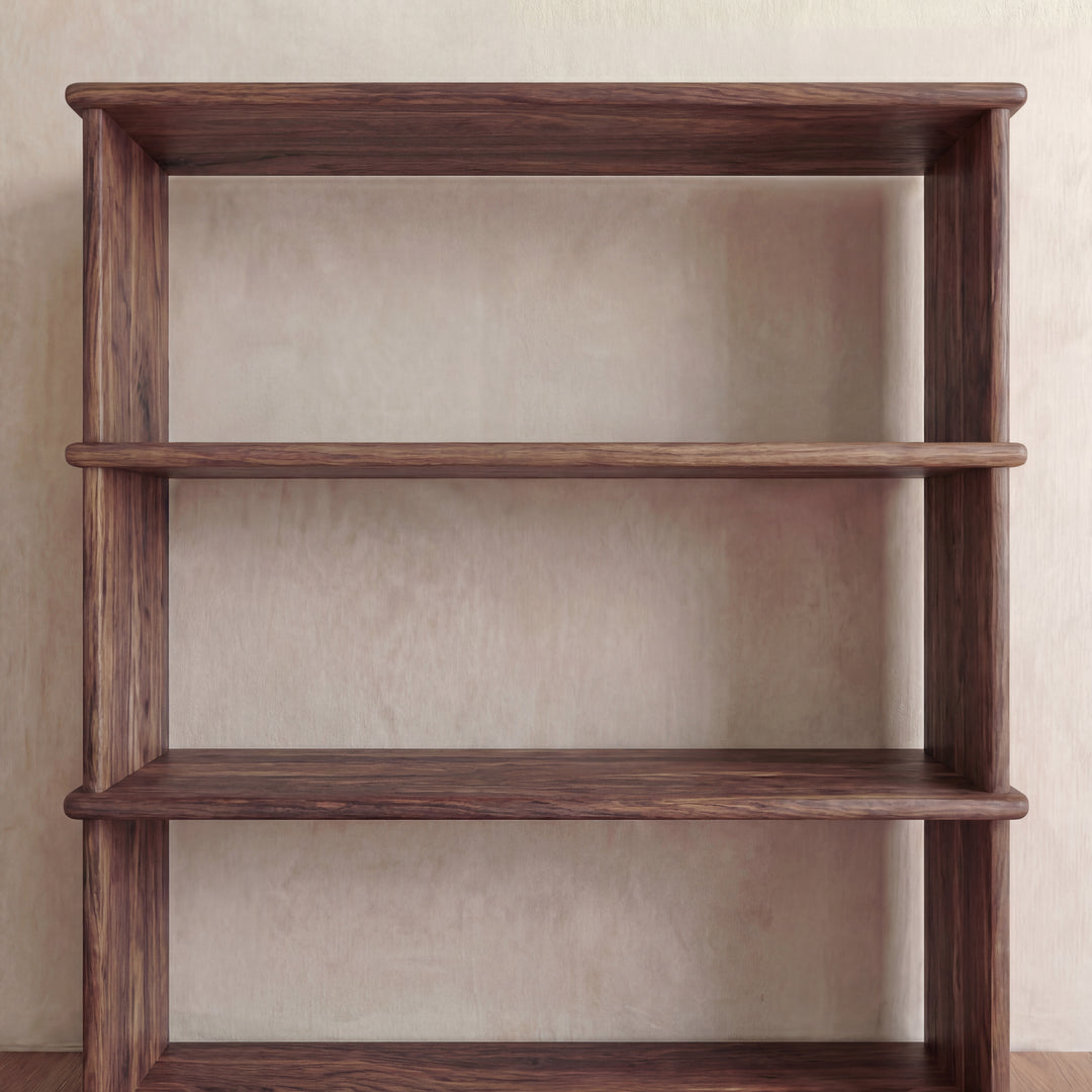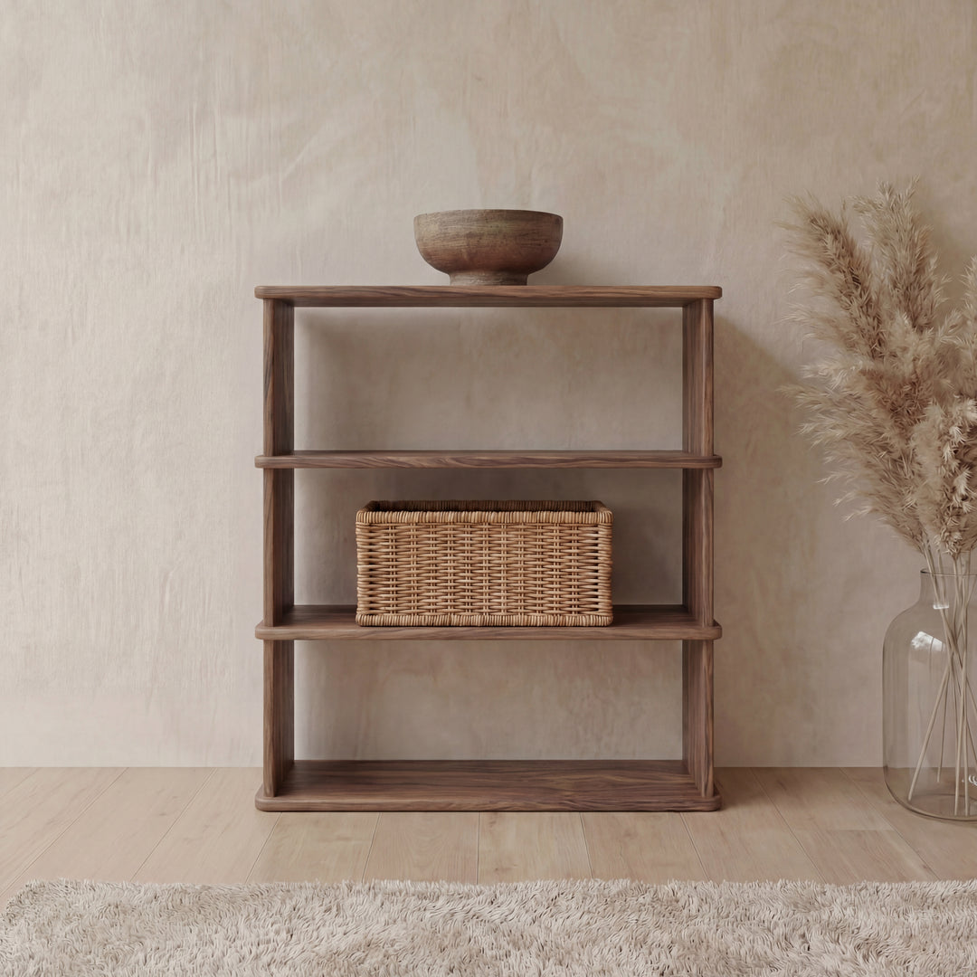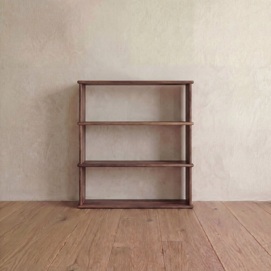 The 3 shelf bookcase is made entirely out of solid, kiln dried walnut, finished with a non-toxic hard wax oil to highlight the wood's natural colour and rounded over subtly to soften all of the edges.
