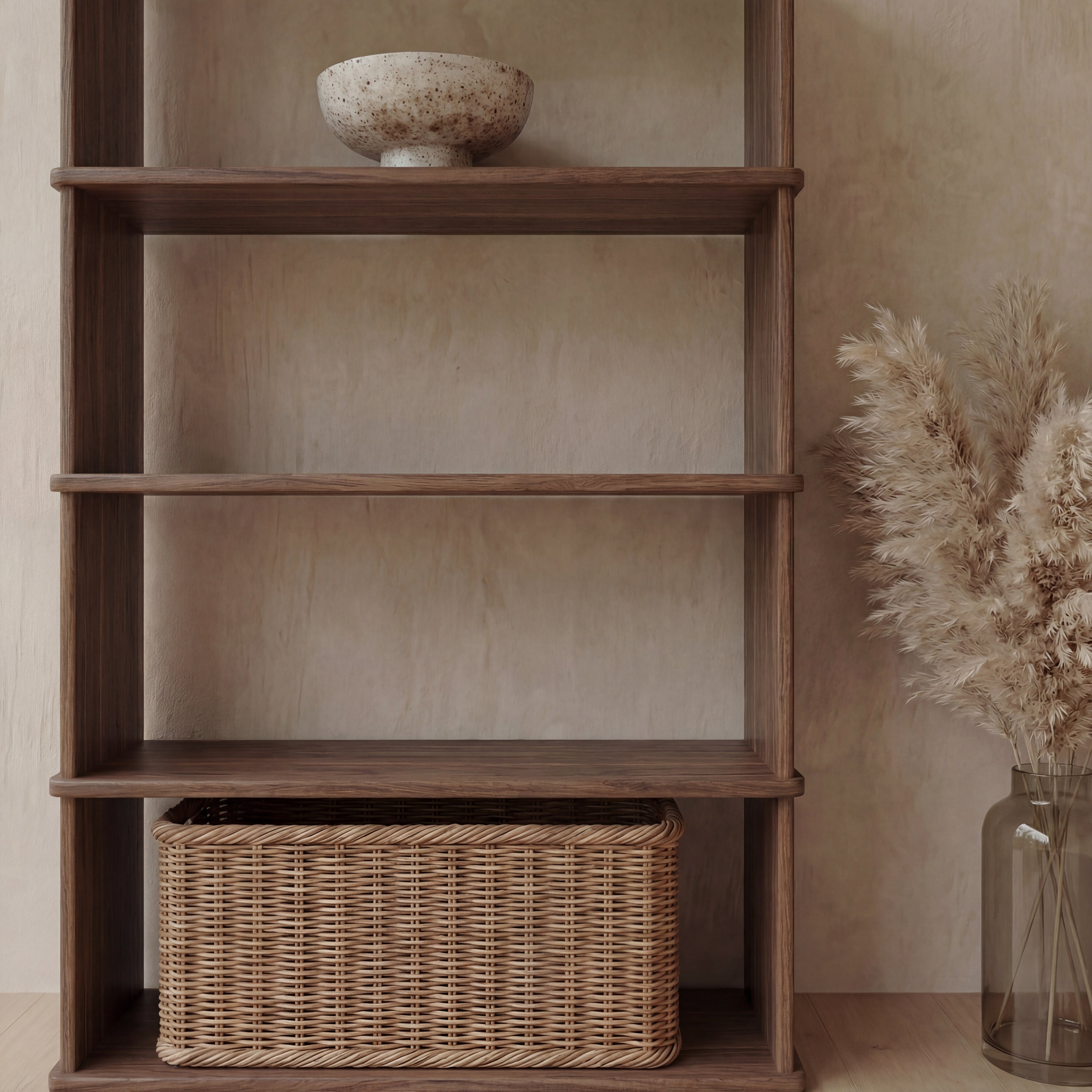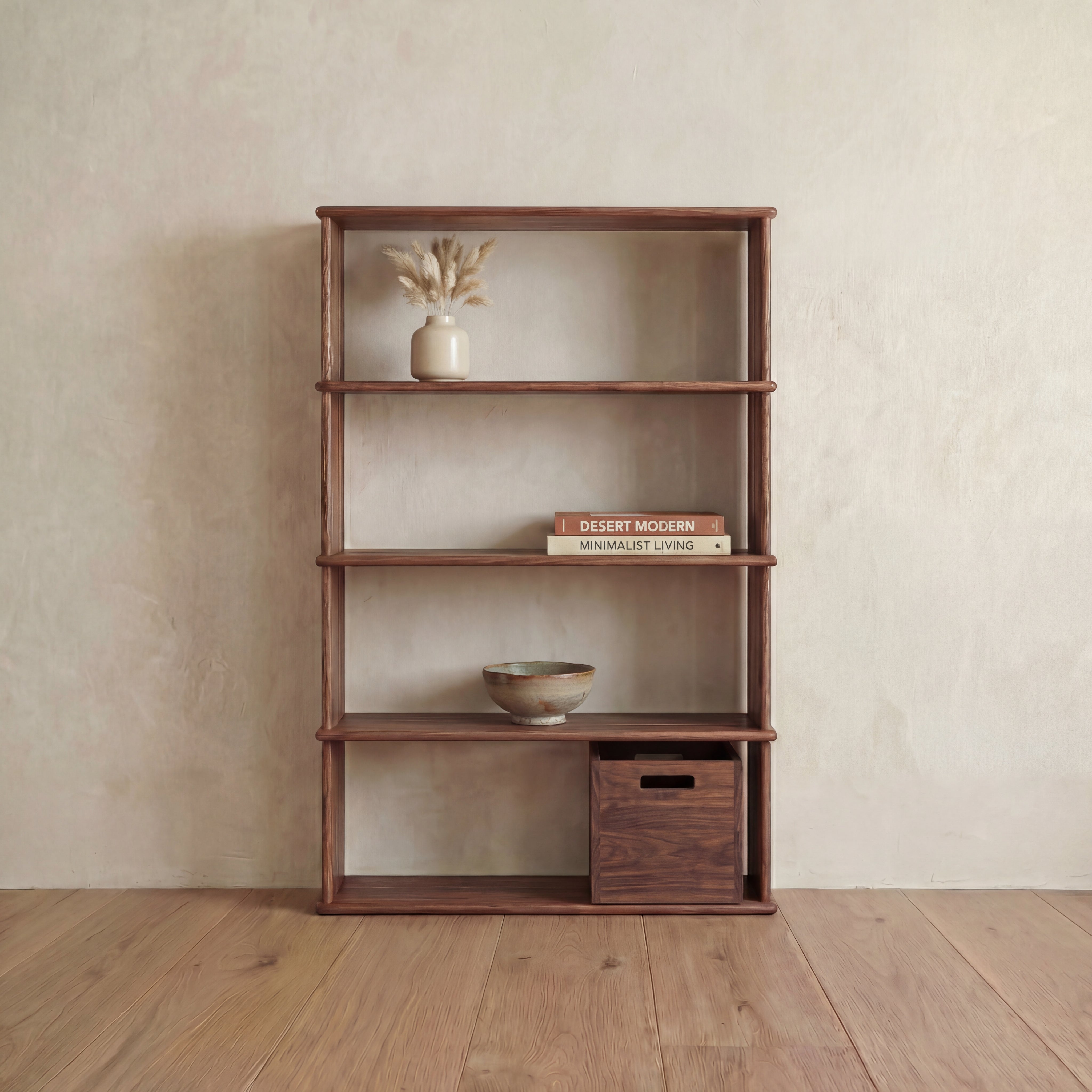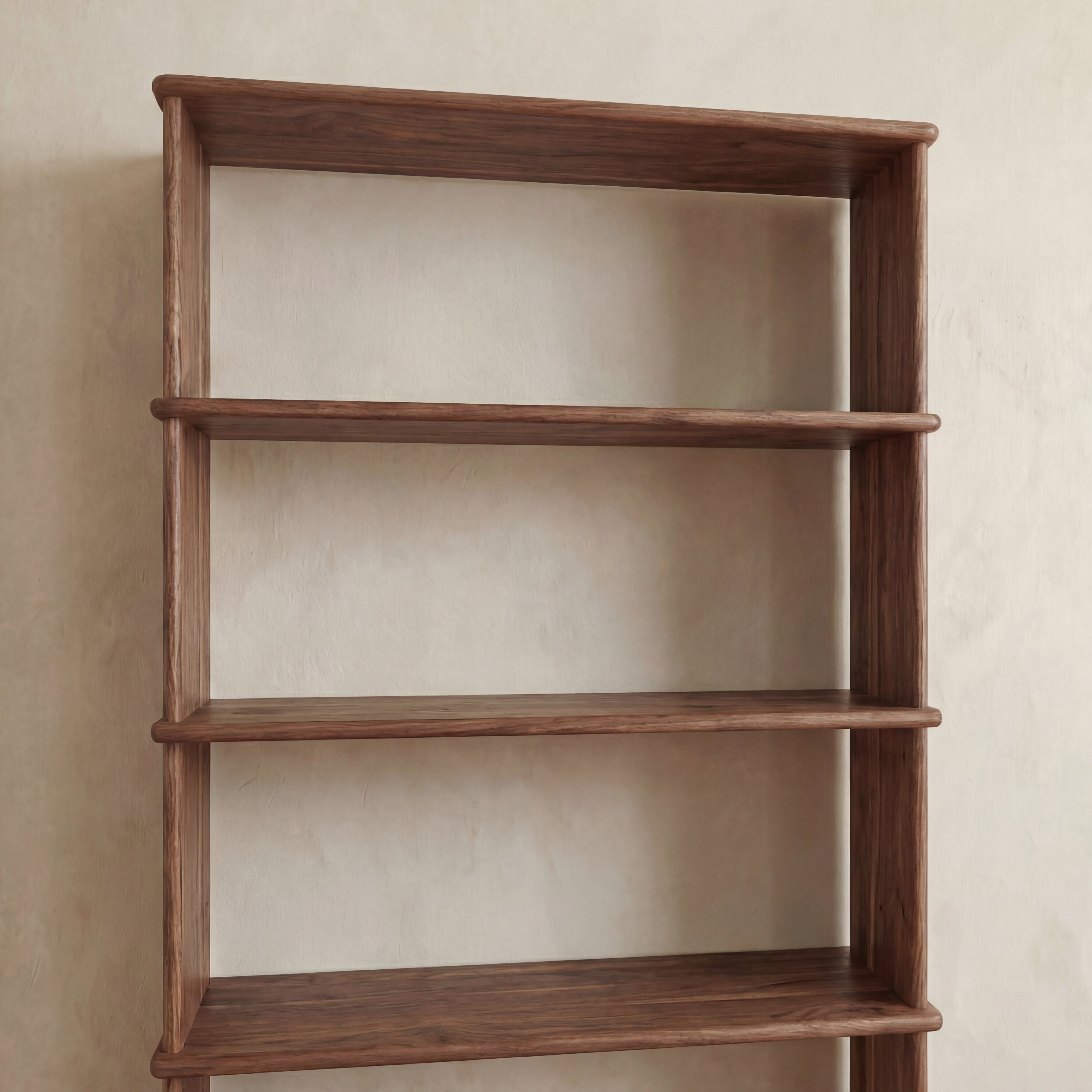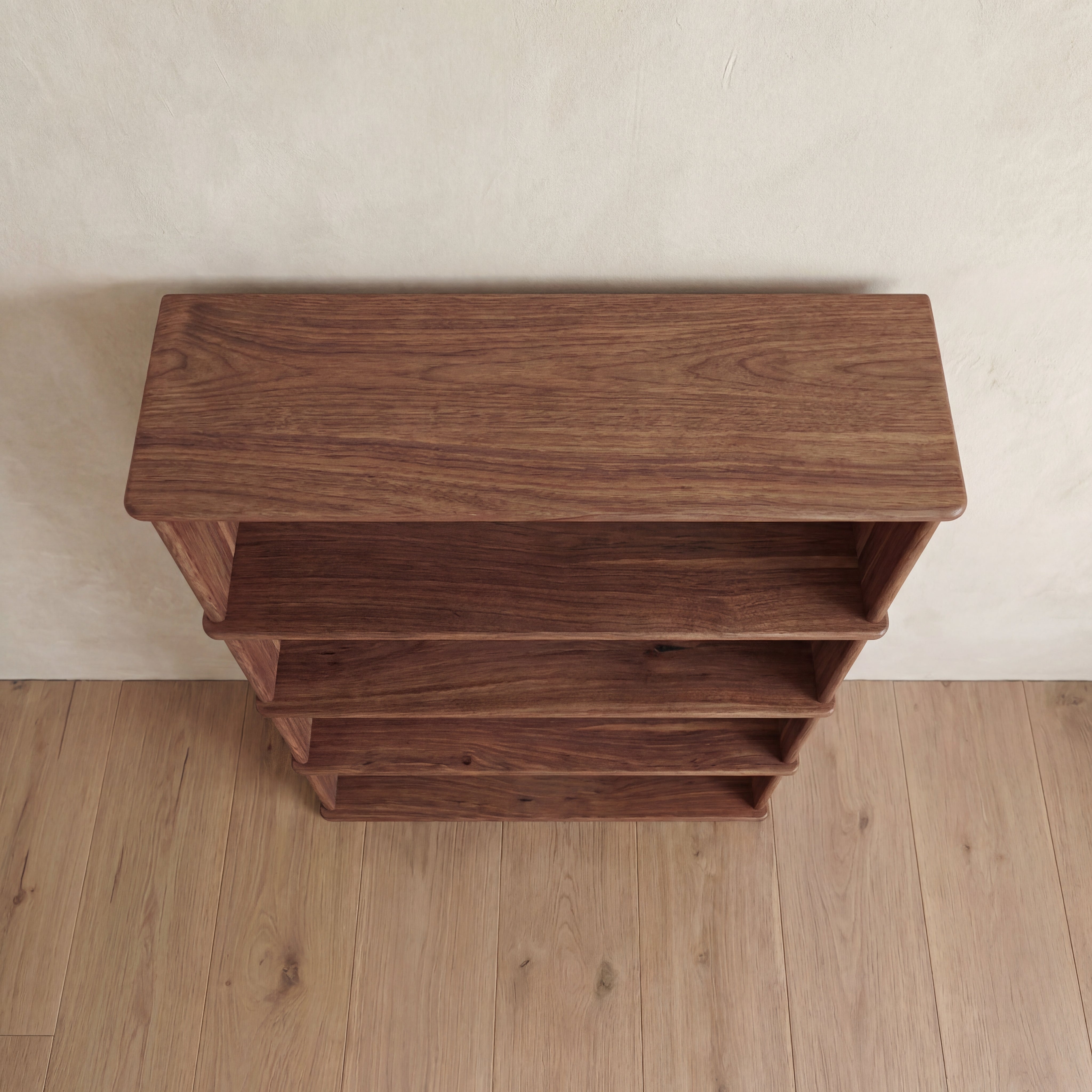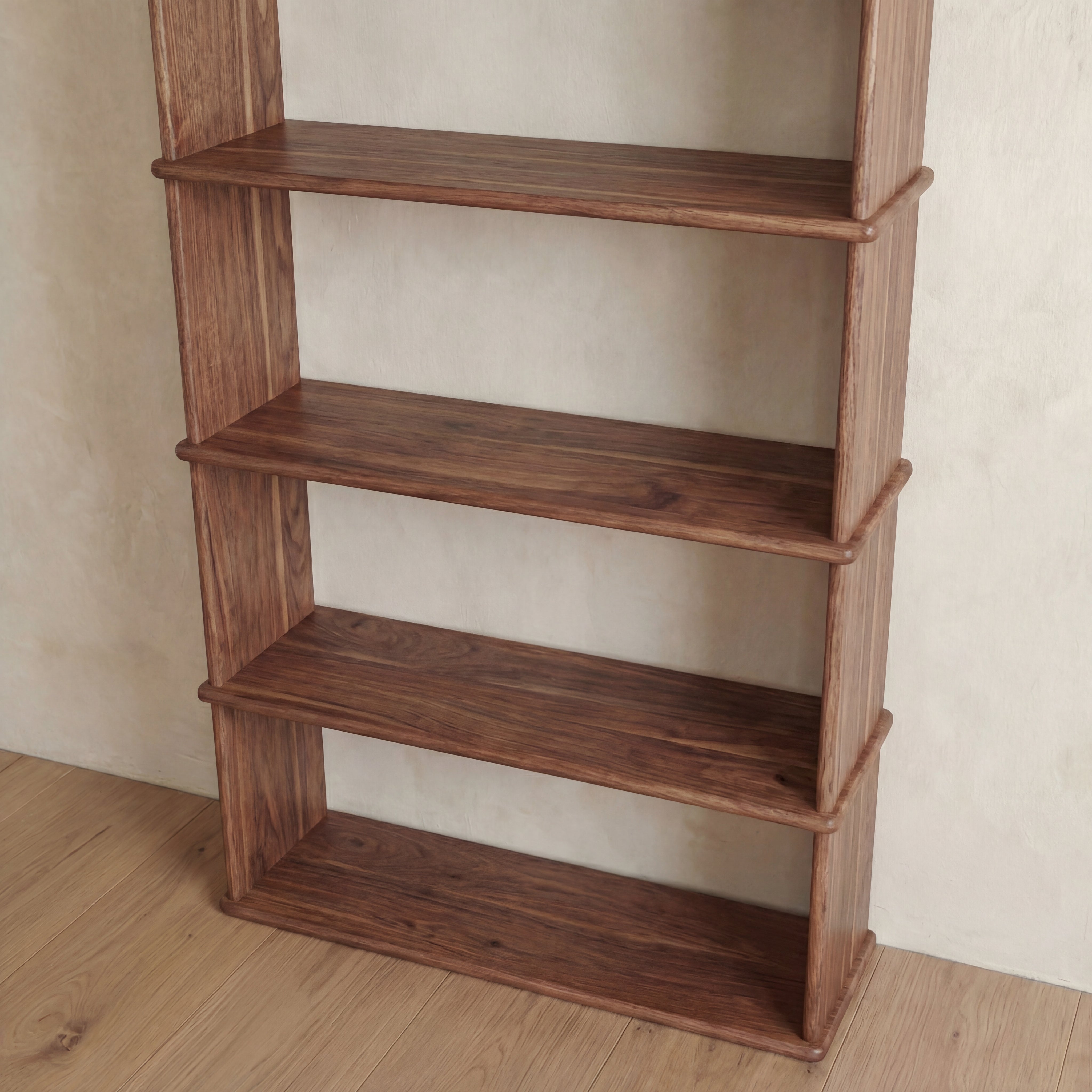 The 4 shelf bookcase is made entirely out of solid, kiln dried walnut, finished with a non-toxic hard wax oil to highlight the wood's natural colour and rounded over subtly to soften all of the edges.