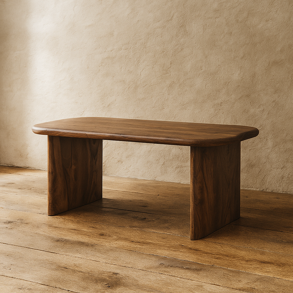 A 40 inch coffee table in solid walnut, featuring softly rounded edges and a minimalist profile. Made by hand in Vancouver, BC.