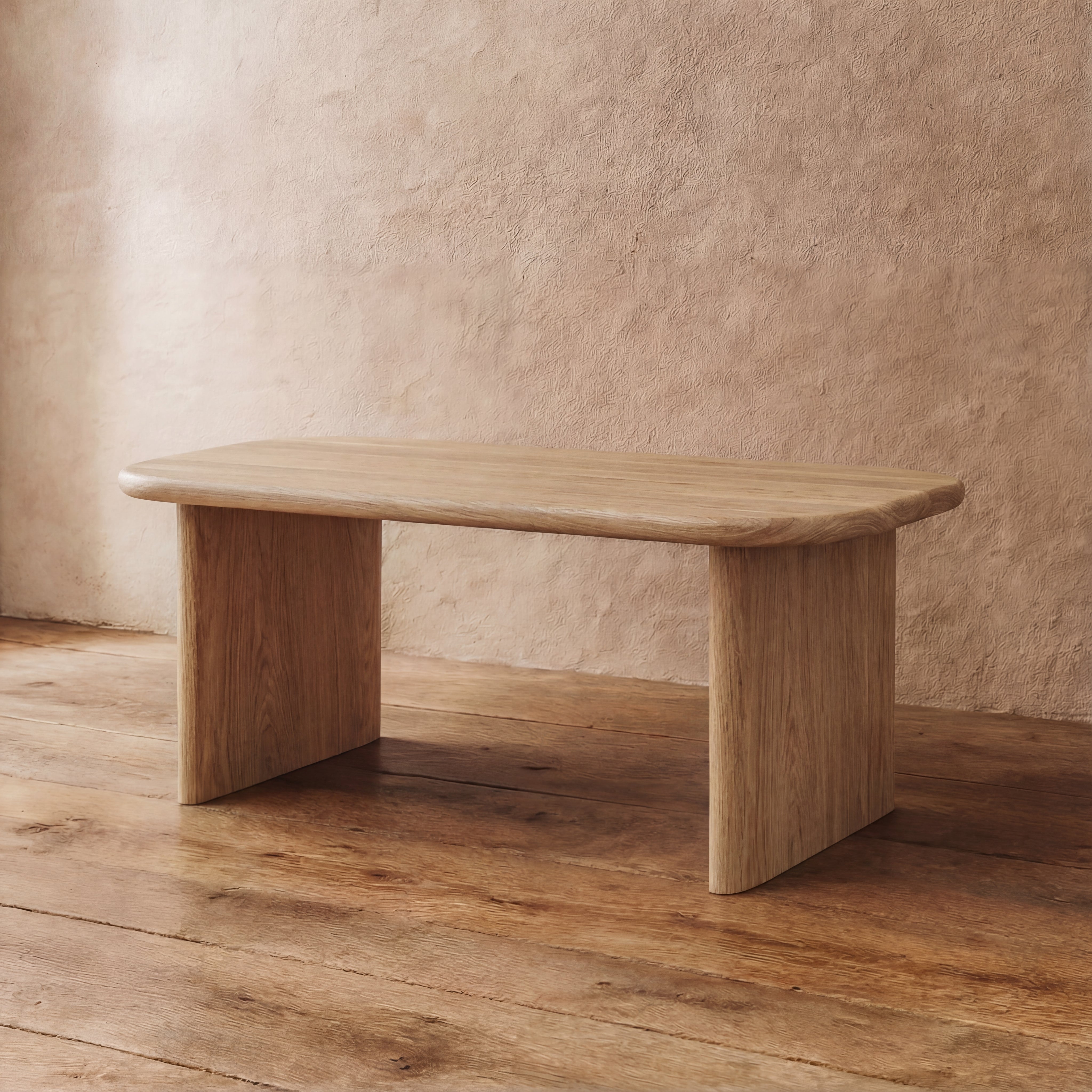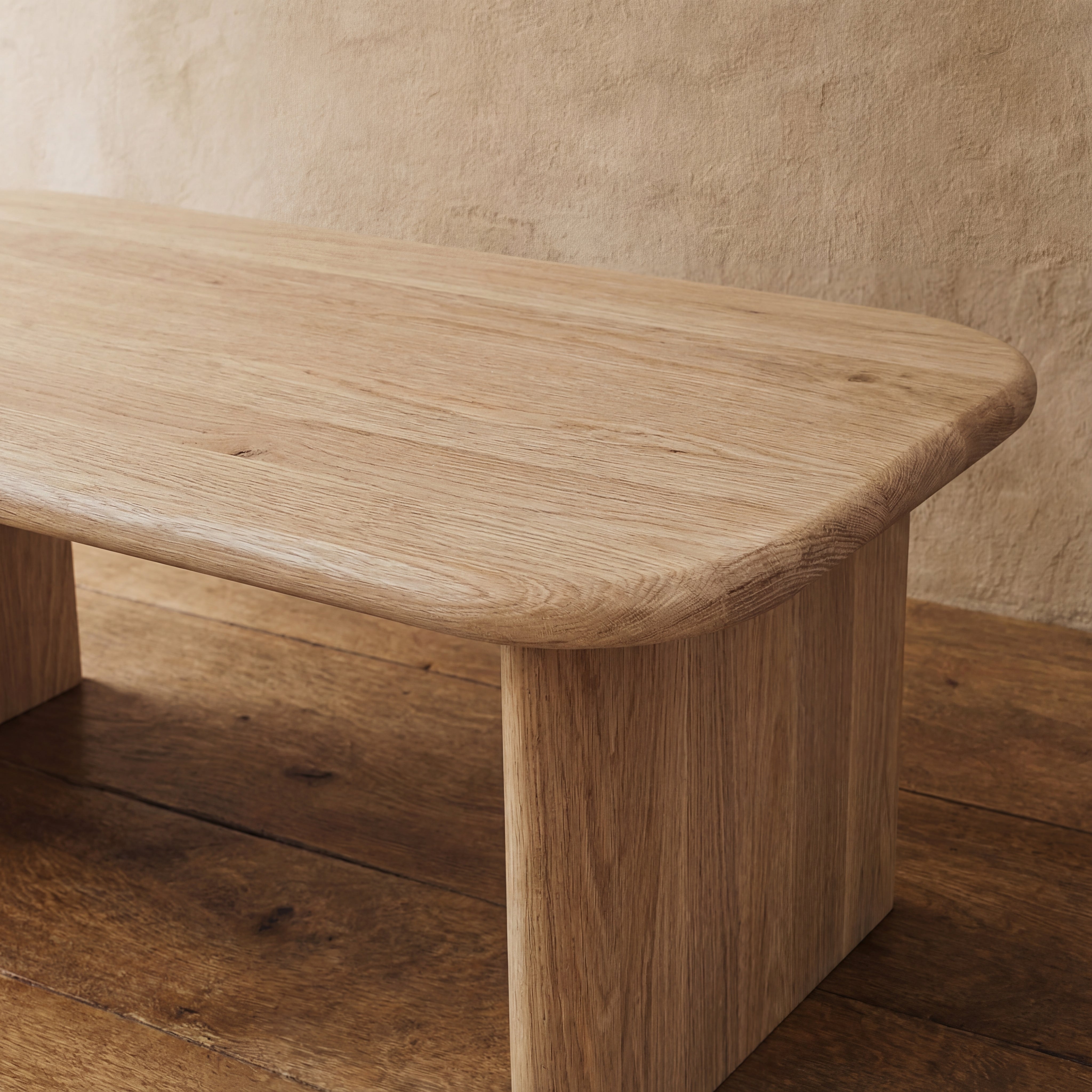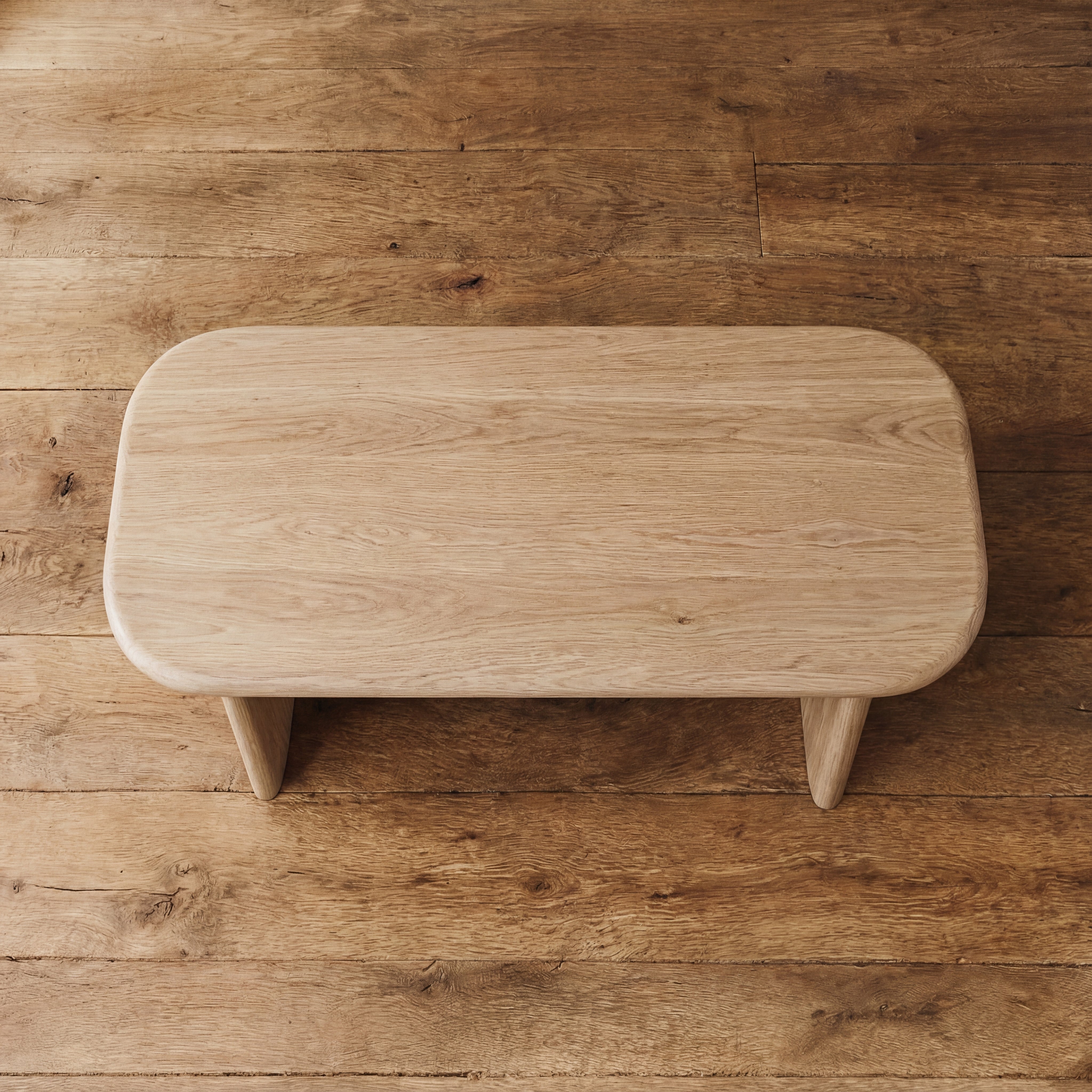 A 40 inch coffee table in solid white oak, featuring softly rounded edges and a minimalist profile. Made by hand in Vancouver, BC.