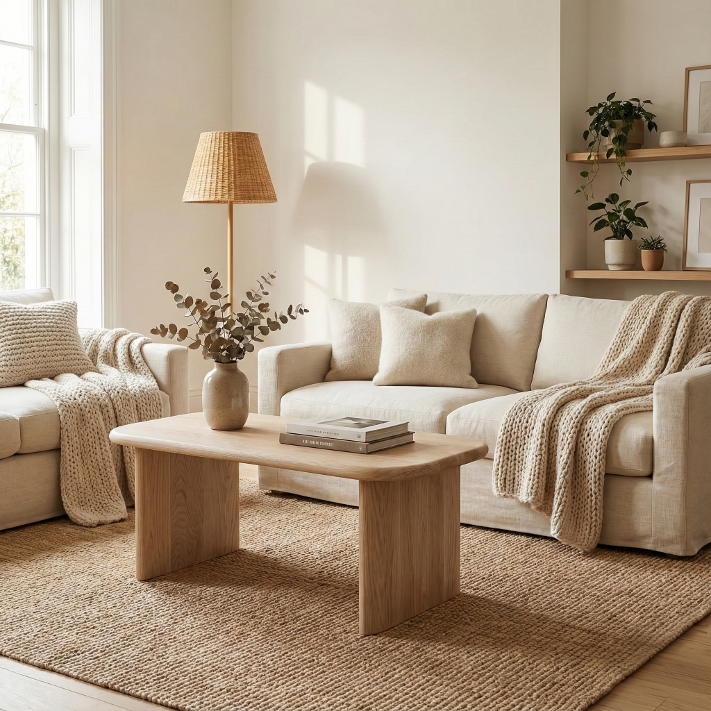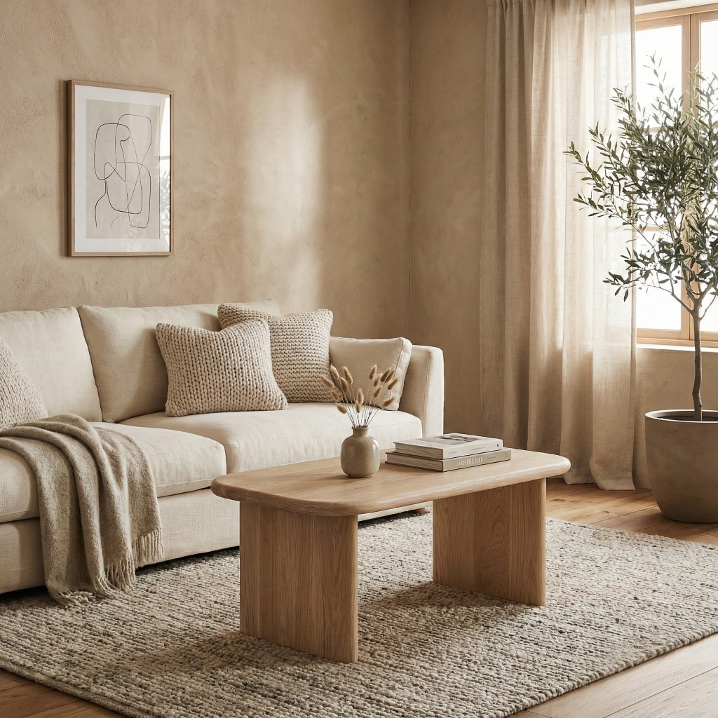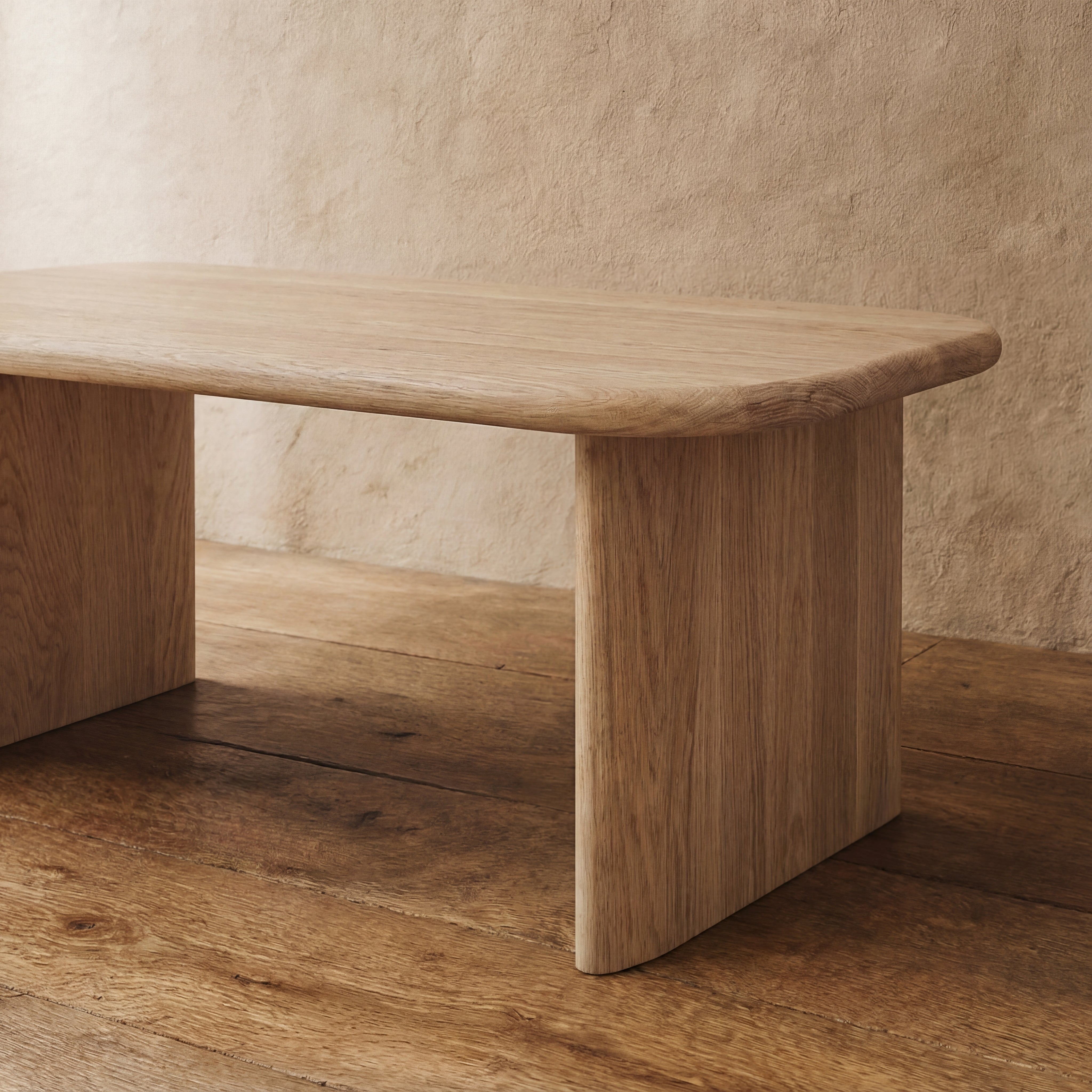 A 40 inch coffee table in solid white oak, featuring softly rounded edges and a minimalist profile. Made by hand in Vancouver, BC.