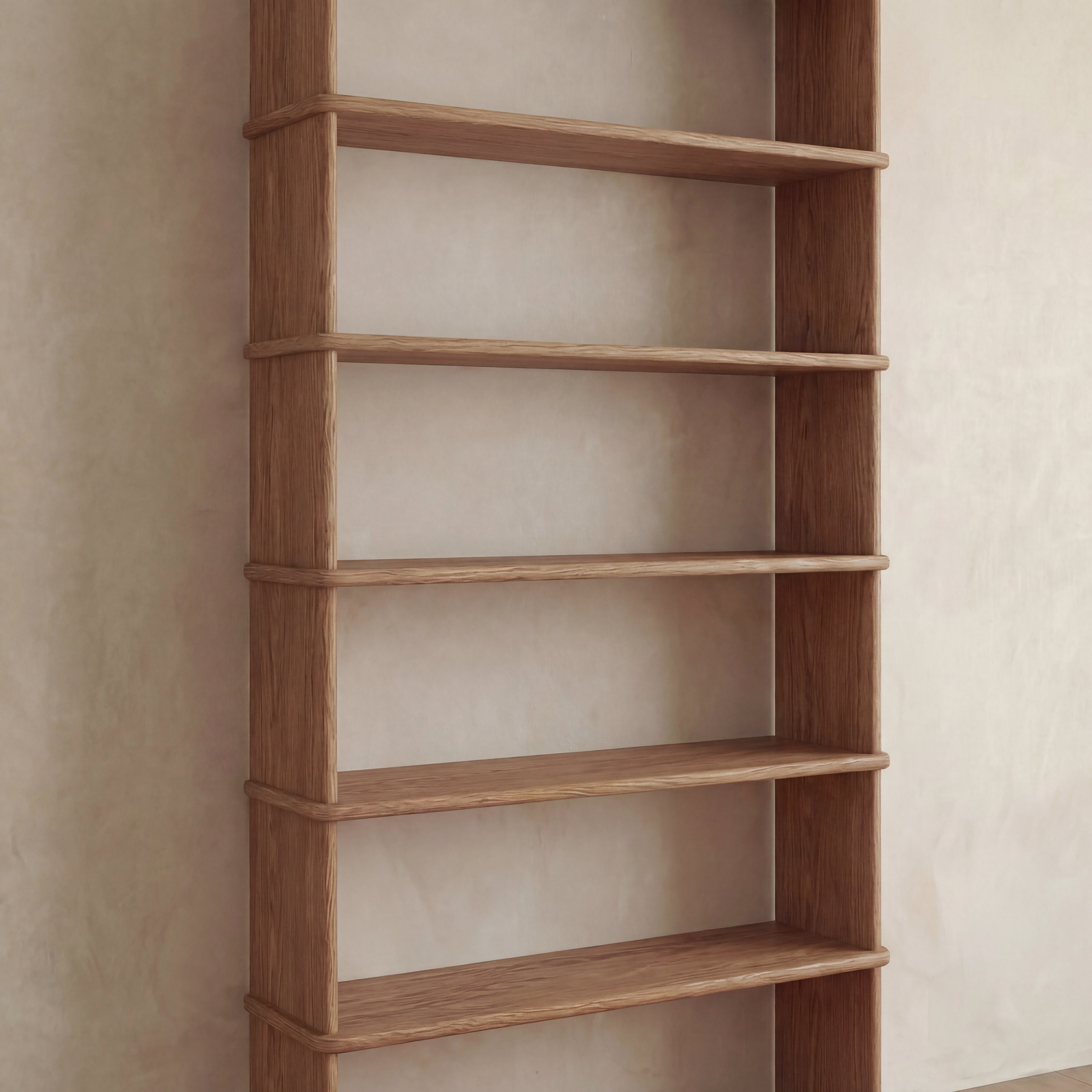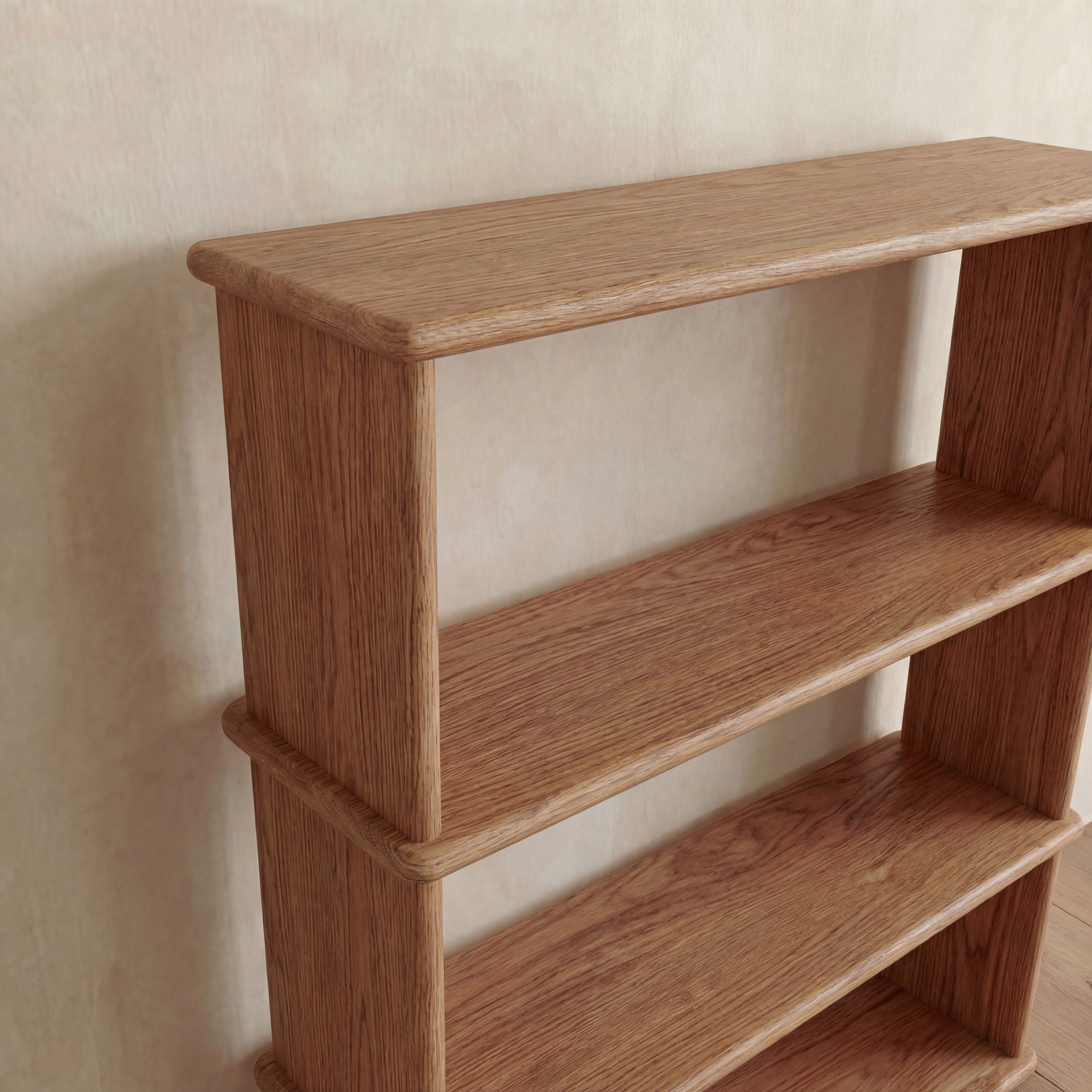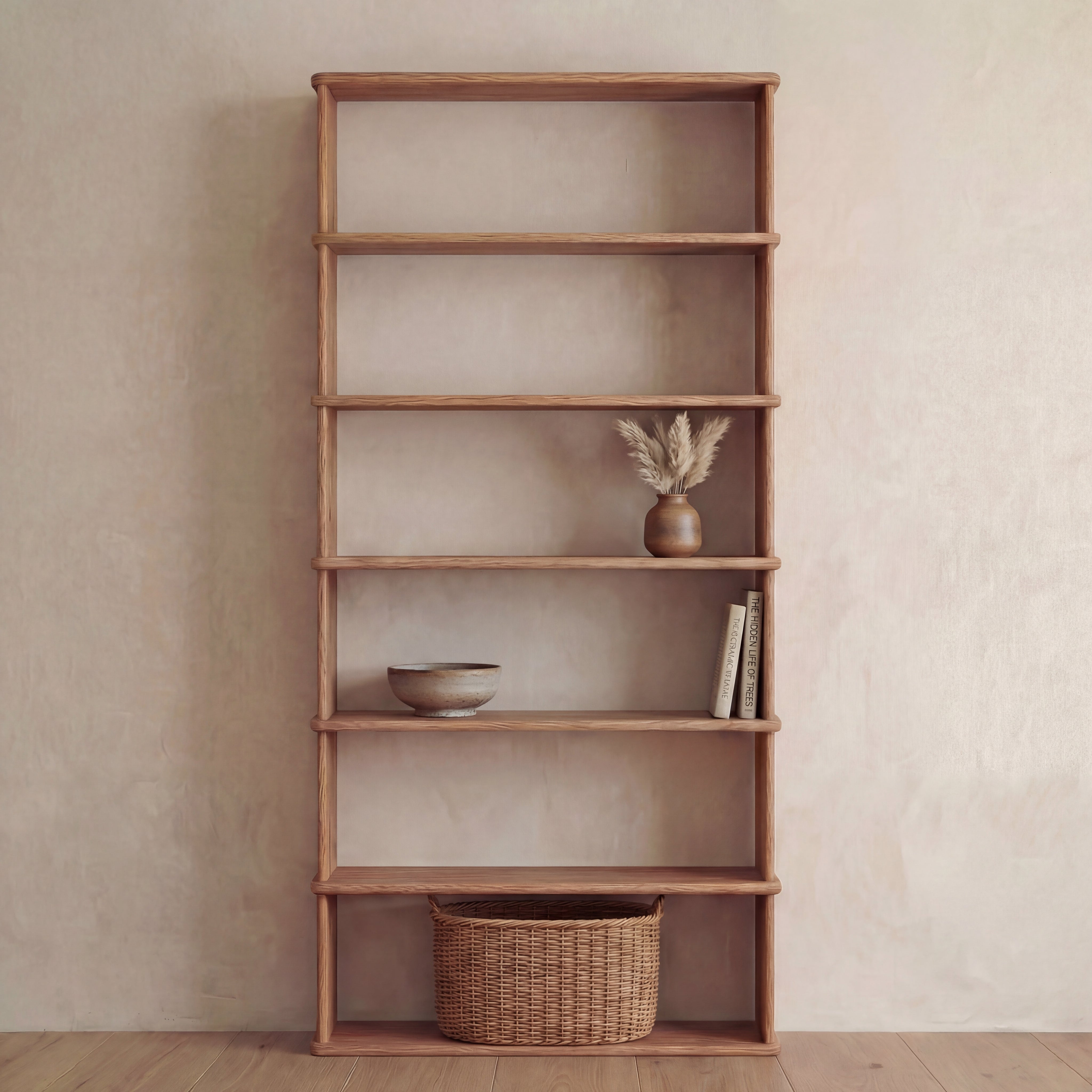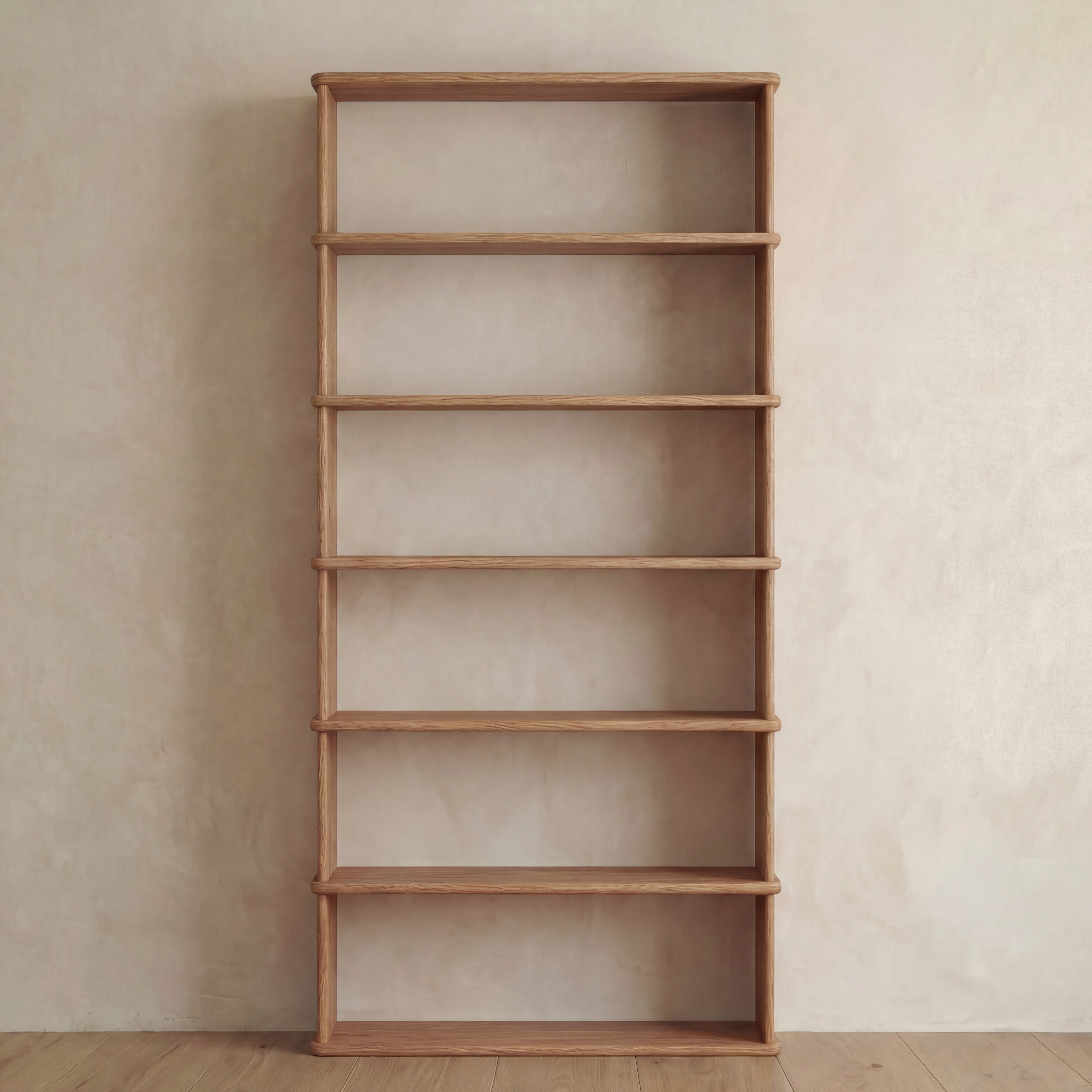 The 6 shelf bookcase is made entirely out of solid, kiln dried red oak, finished with a non-toxic hard wax oil to highlight the wood's natural colour and rounded over subtly to soften all of the edges.