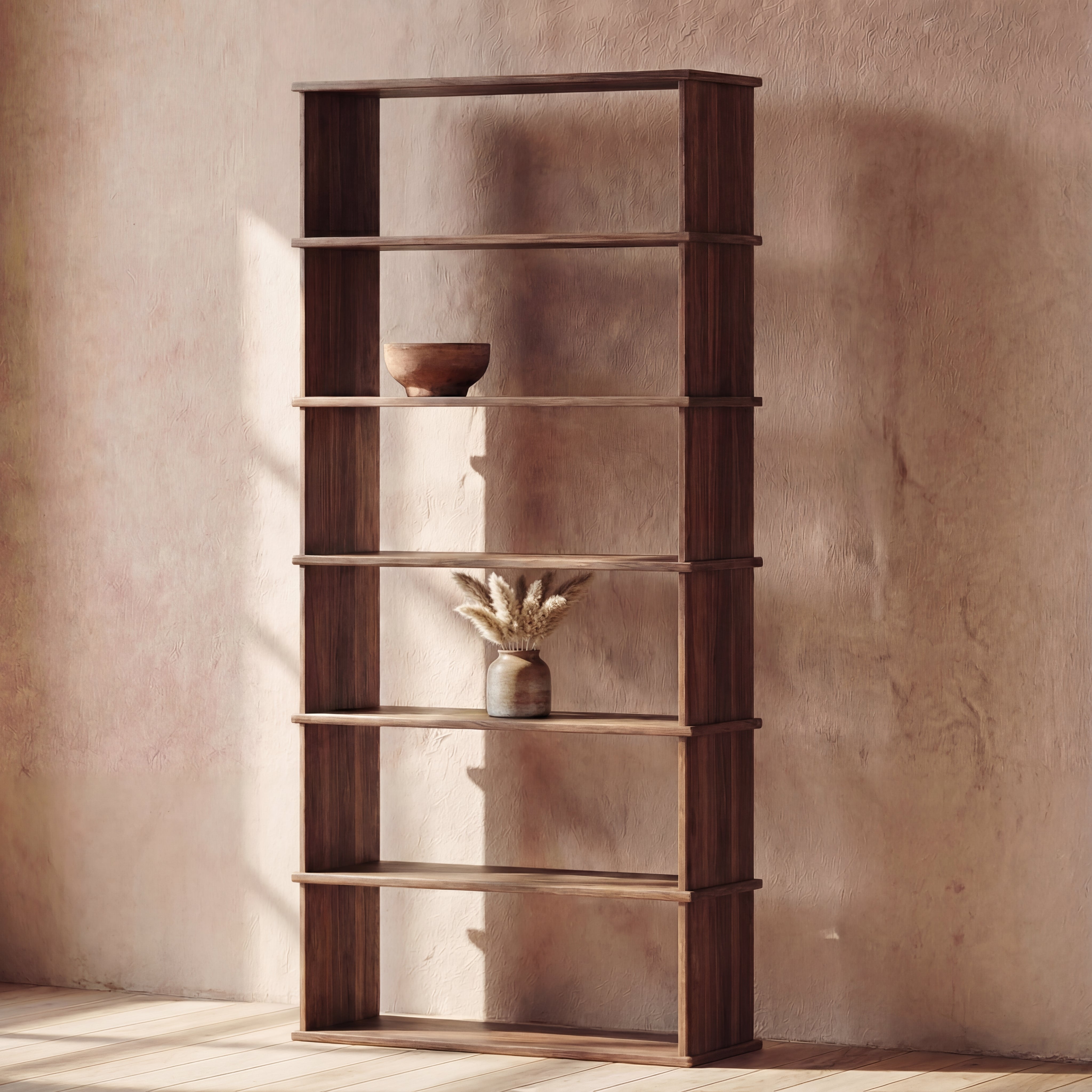 The 6 shelf bookcase is made entirely out of solid, kiln dried walnut, finished with a non-toxic hard wax oil to highlight the wood's natural colour and rounded over subtly to soften all of the edges.