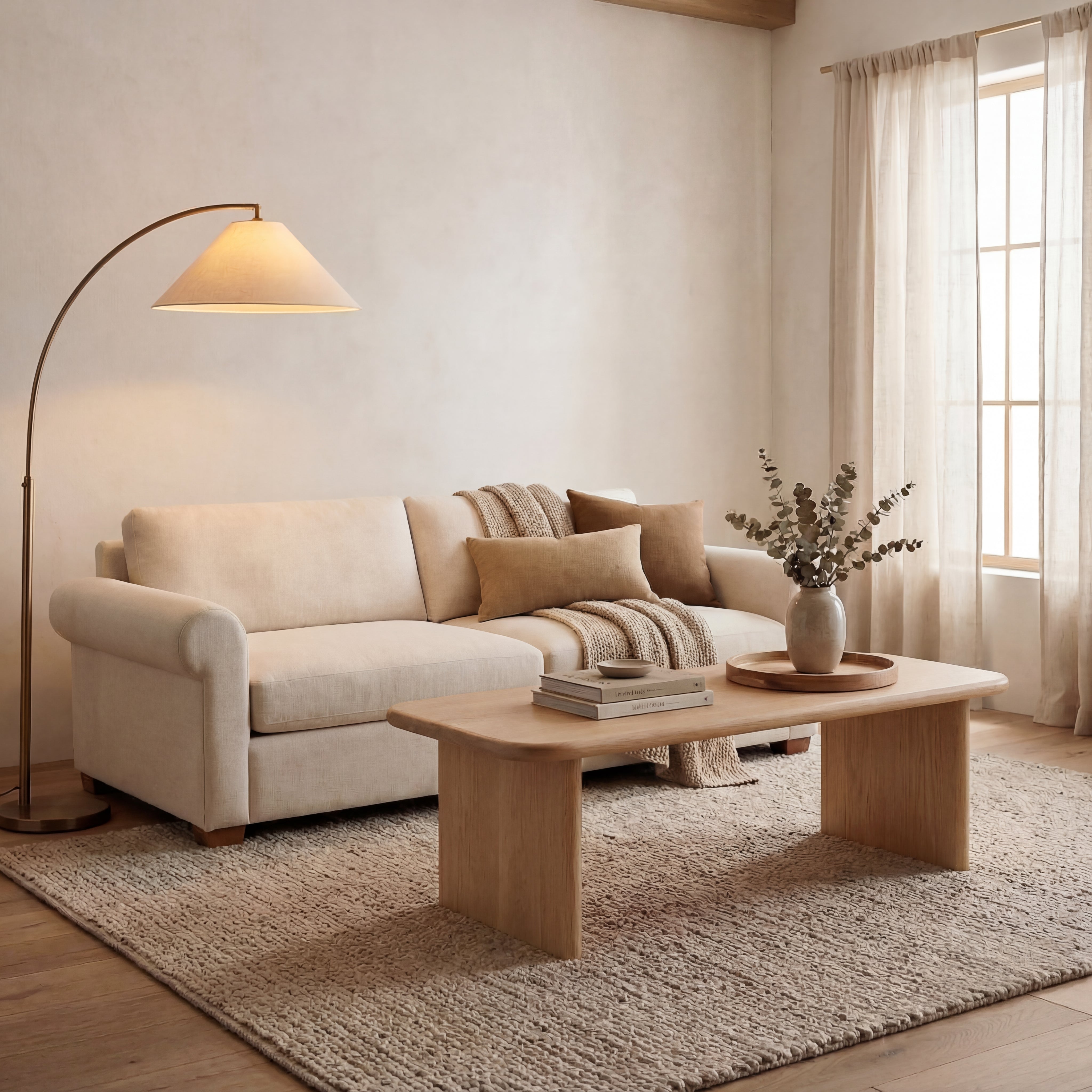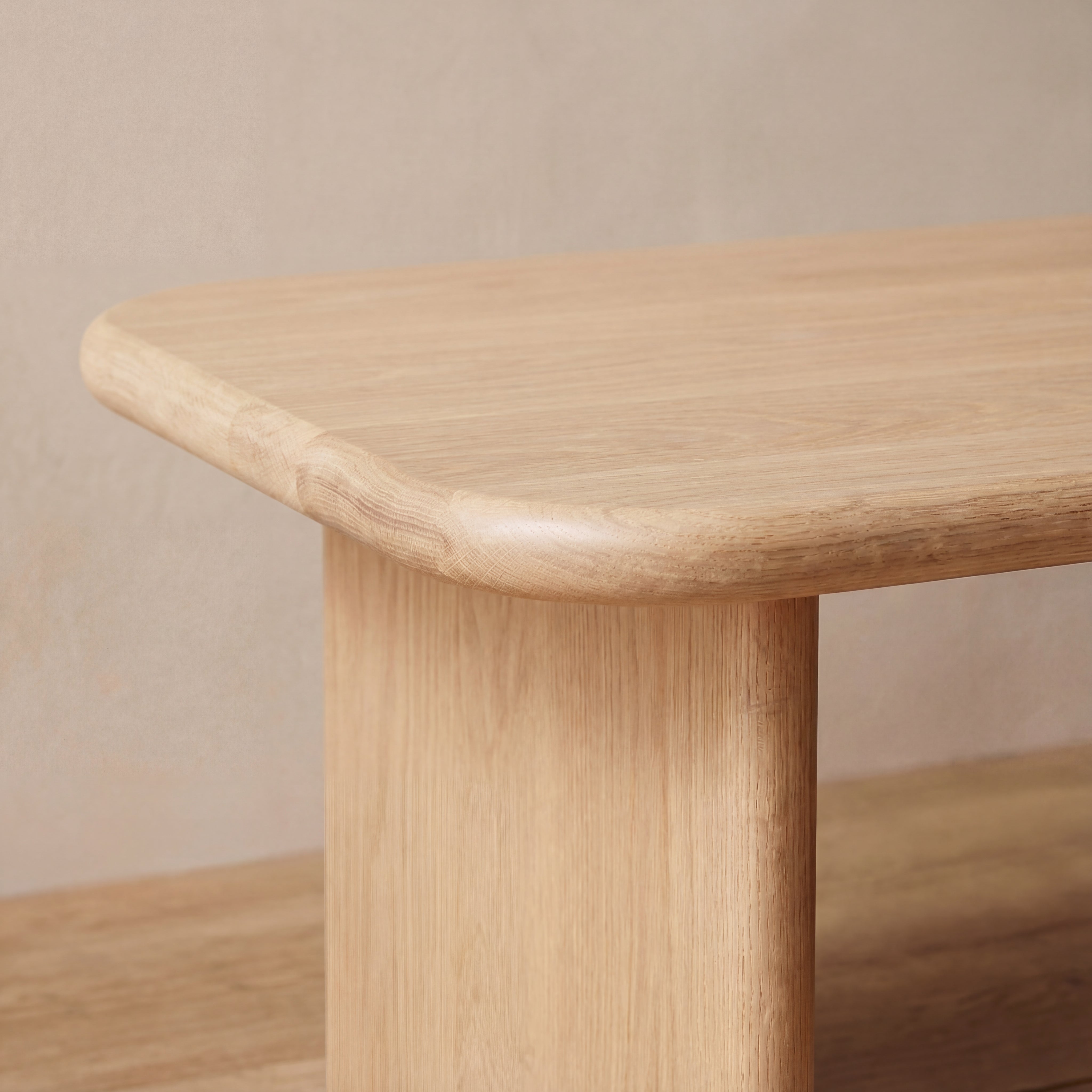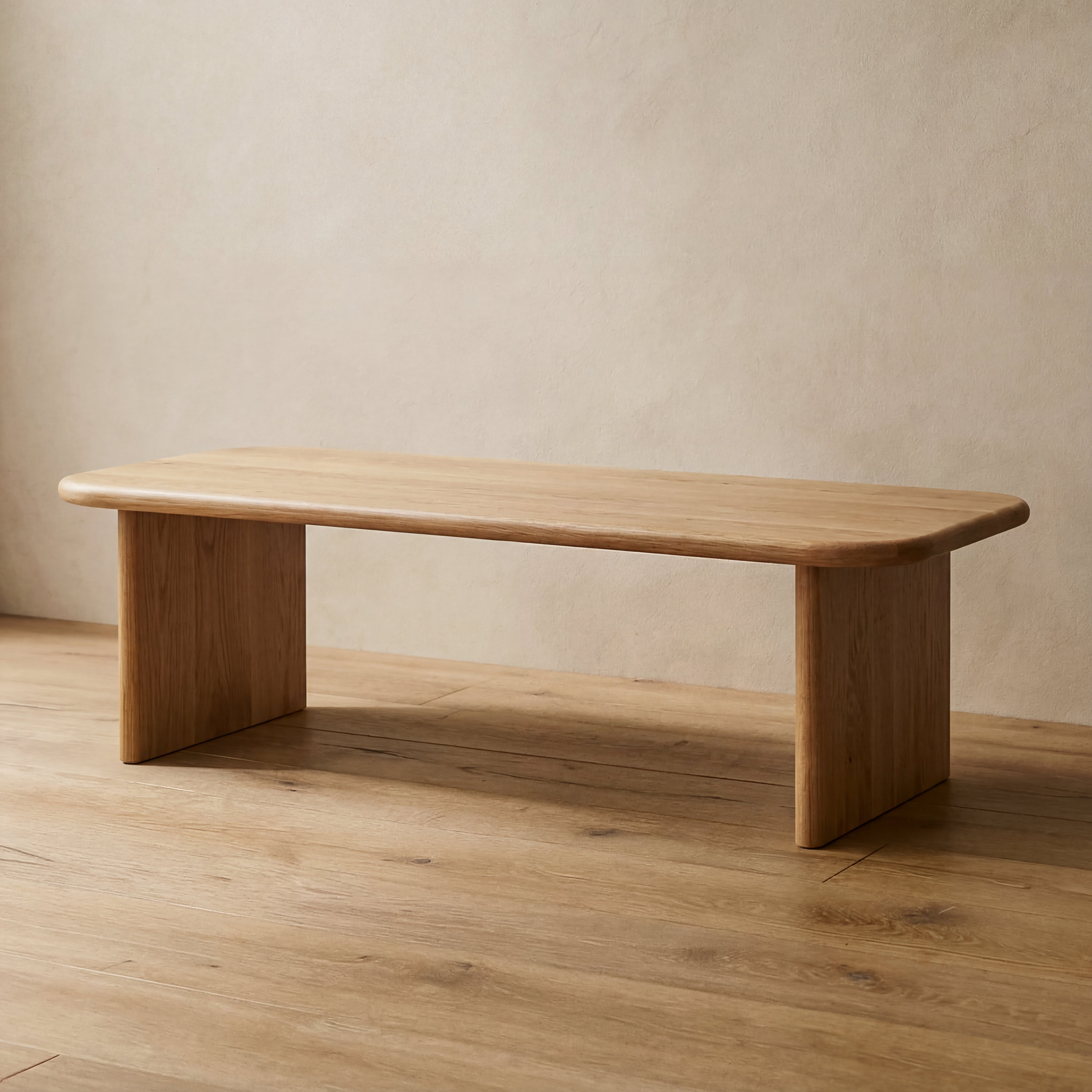 A 60 inch coffee table in solid white oak, featuring softly rounded edges and a minimalist profile. Made by hand in Vancouver, BC.