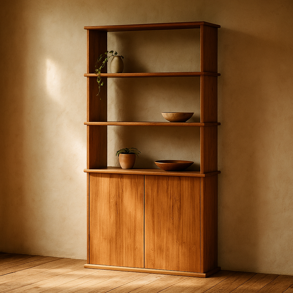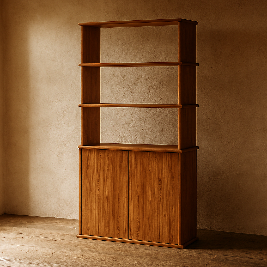 The bookshelf with cabinet is made entirely out of solid, kiln dried red oak, finished with a non-toxic hard wax oil to highlight the wood's natural colour and rounded over subtly to soften all of the edges.