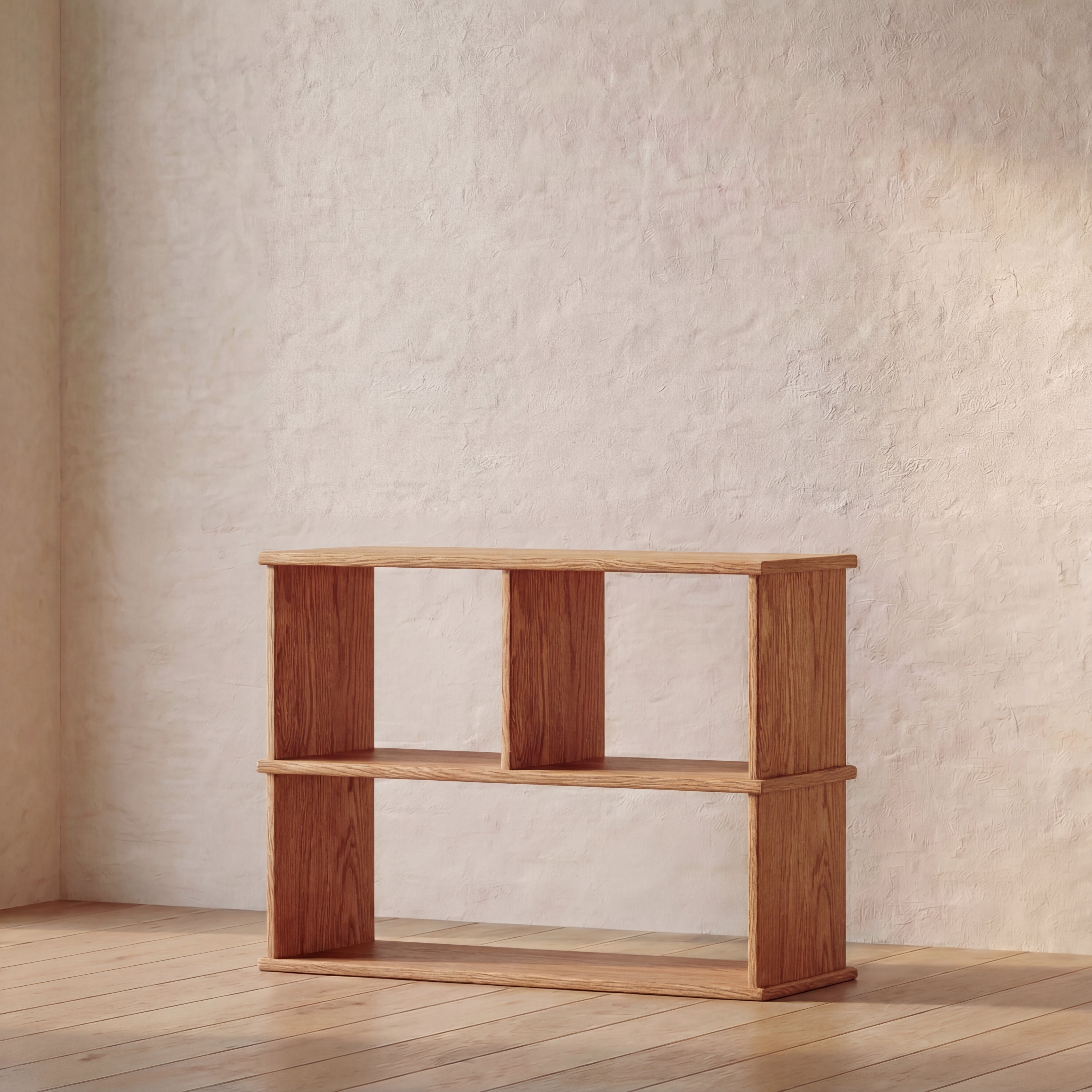 The console bookcase is made entirely out of solid red oak, finished with a non-toxic hard wax oil to highlight the wood's natural colour and rounded over subtly to soften all of the edges.