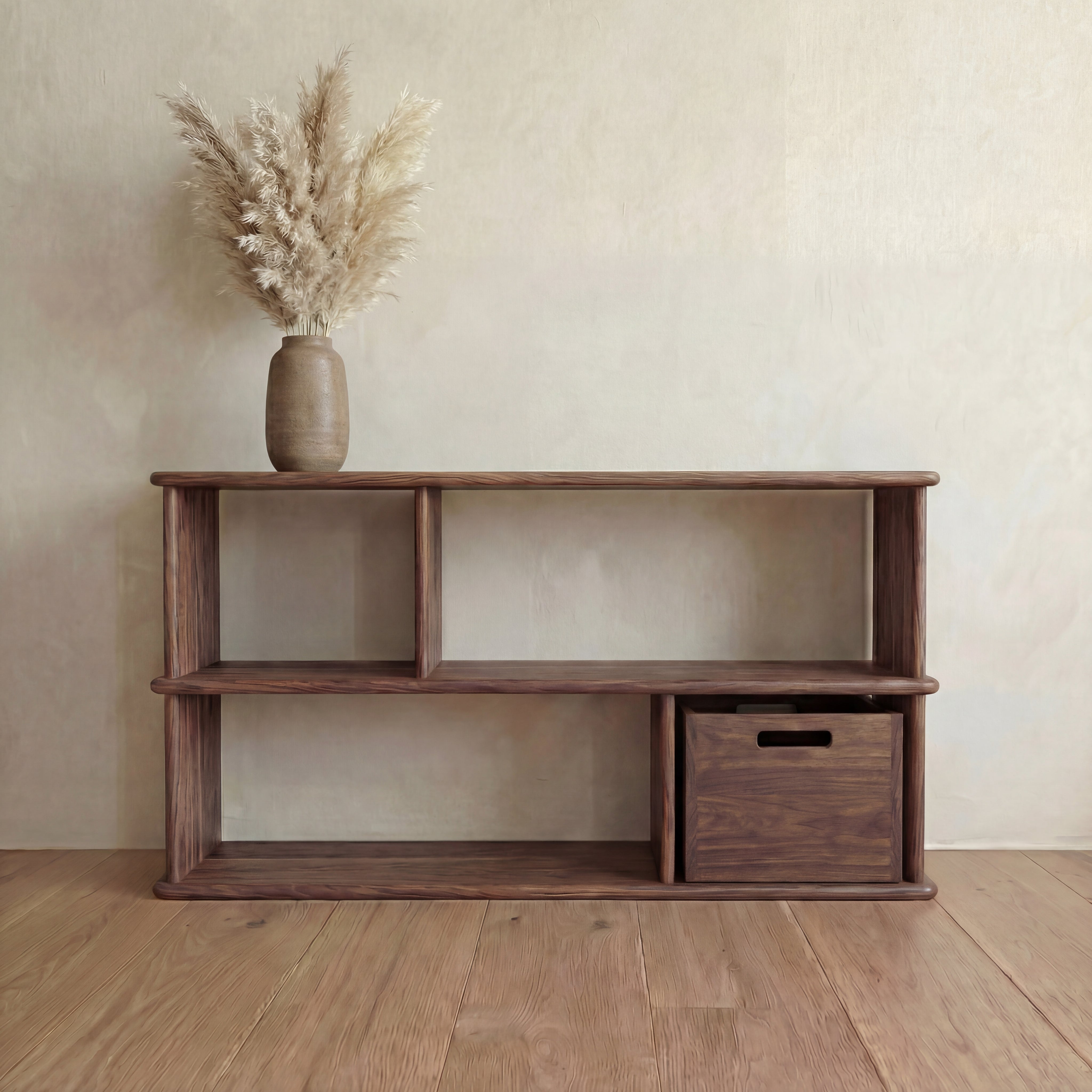 The horizontal bookshelf is made entirely out of solid, kiln dried walnut, finished with a non-toxic hard wax oil to highlight the wood's natural colour and rounded over subtly to soften all of the edges.