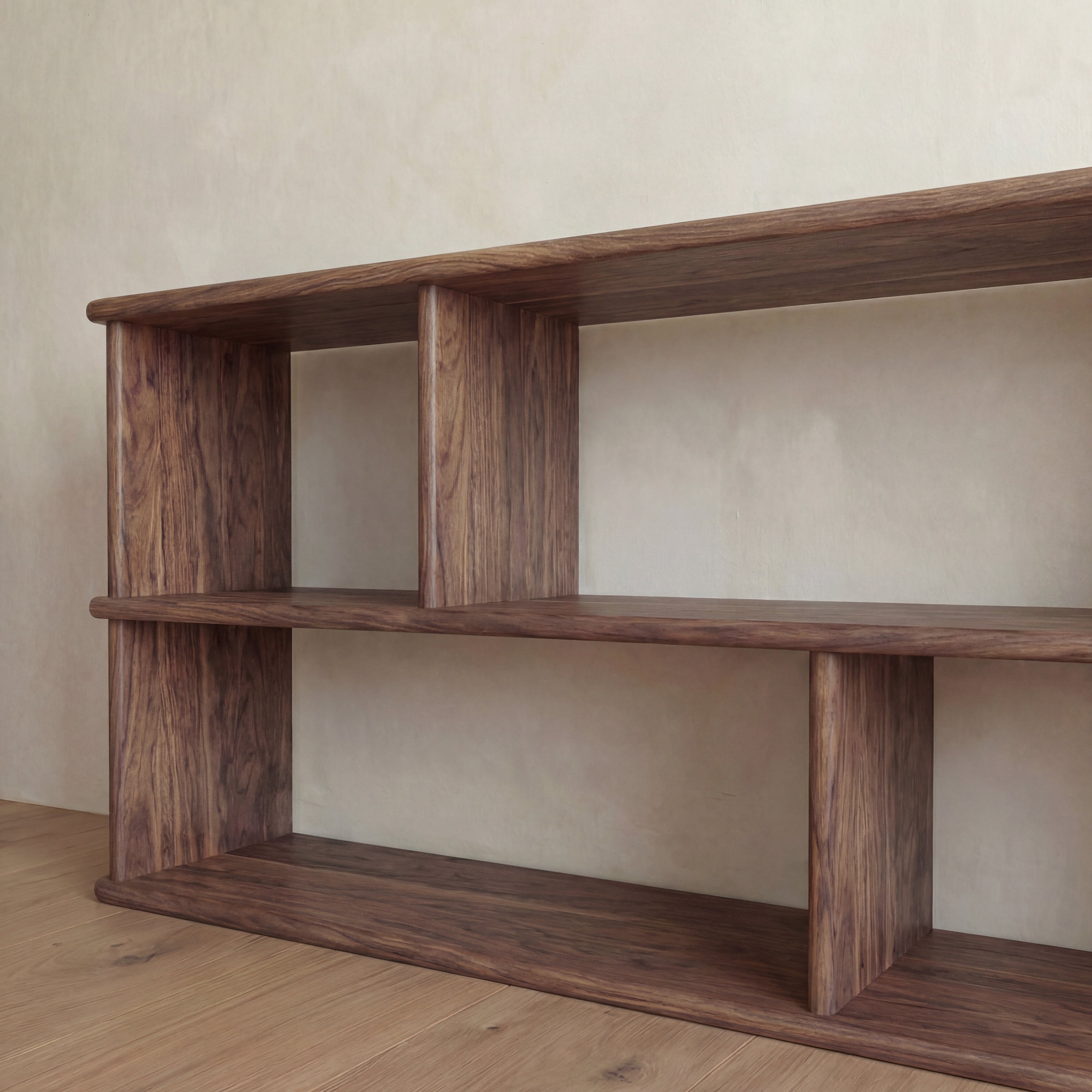 A low horizontal bookshelf in solid walnut, built by hand in Vancouver, BC
