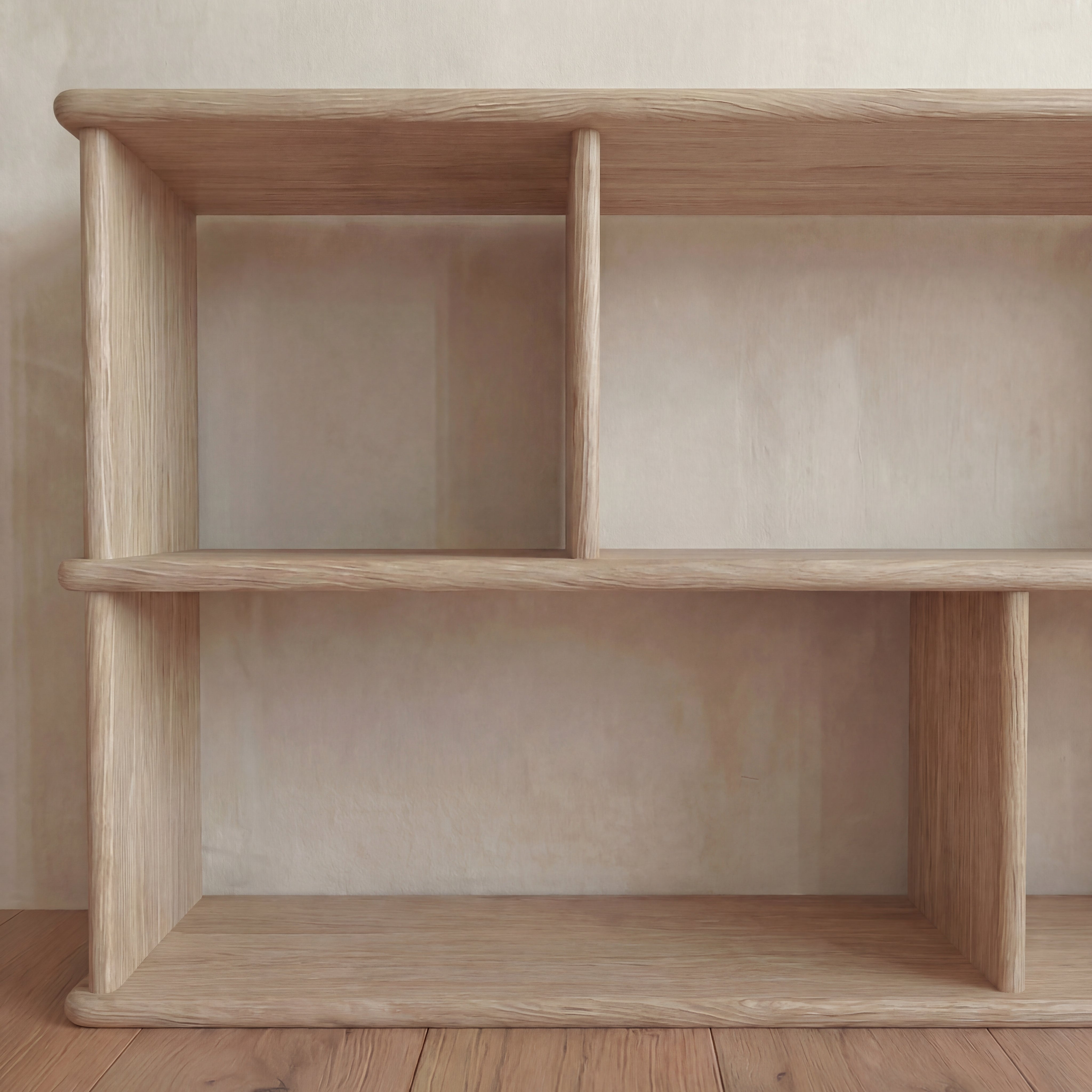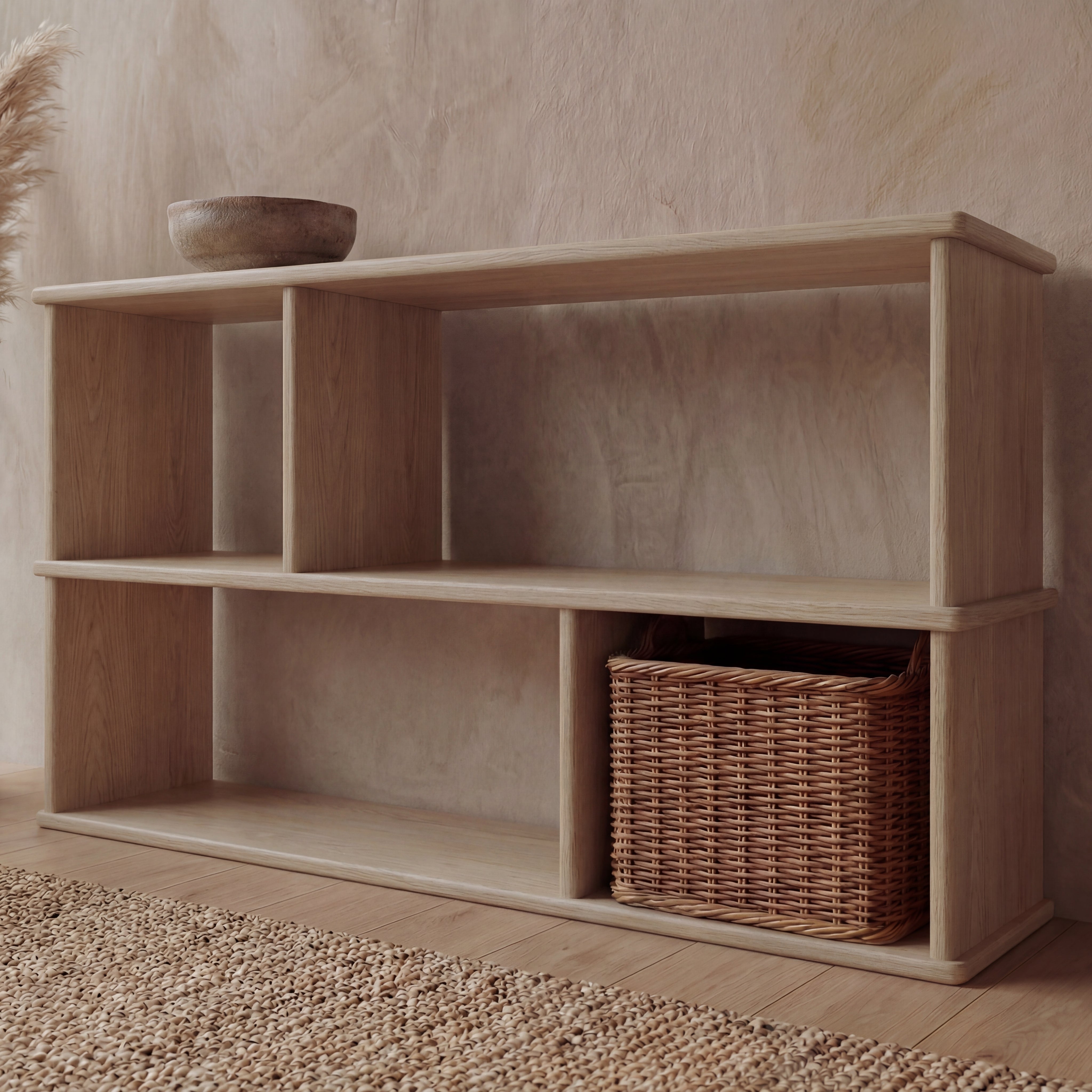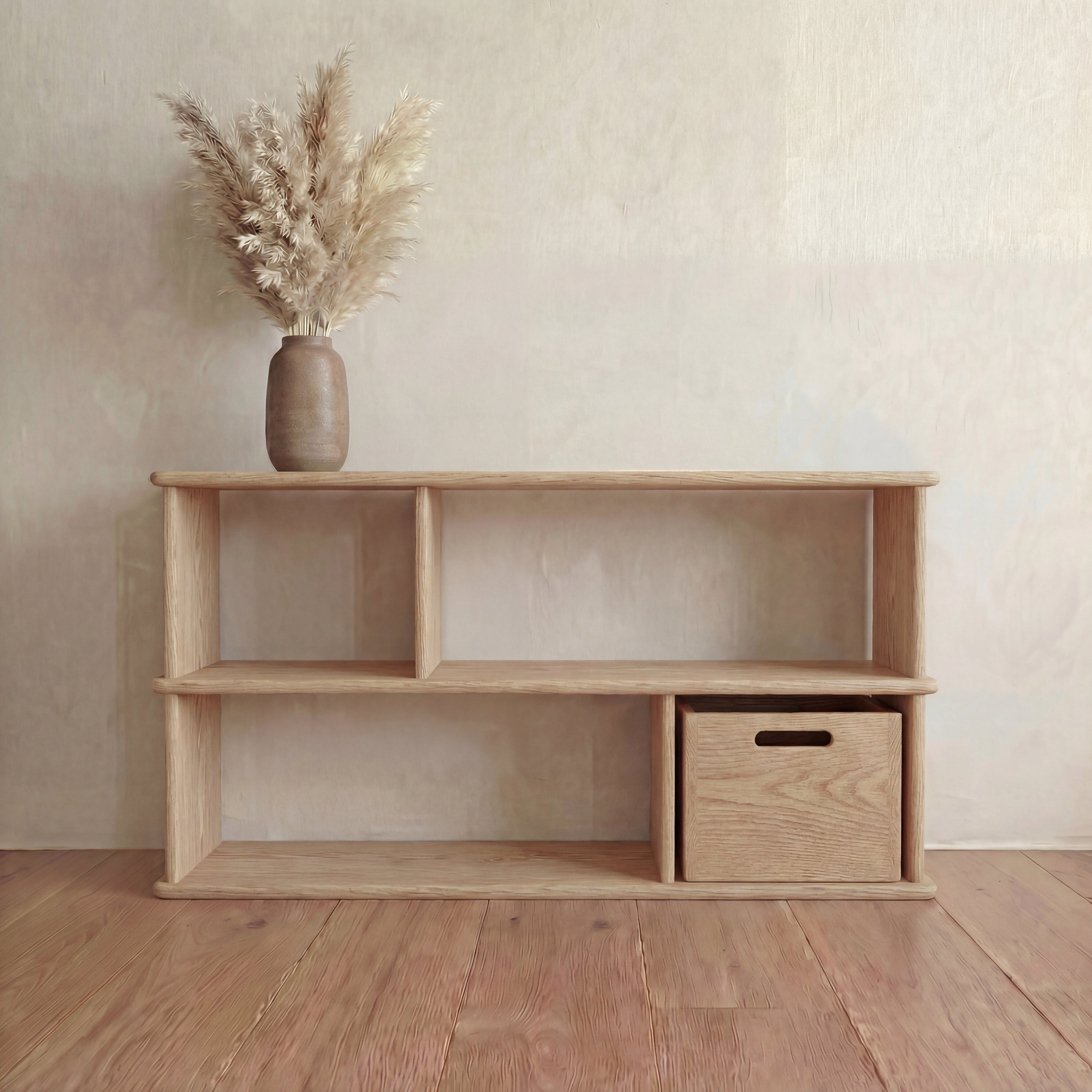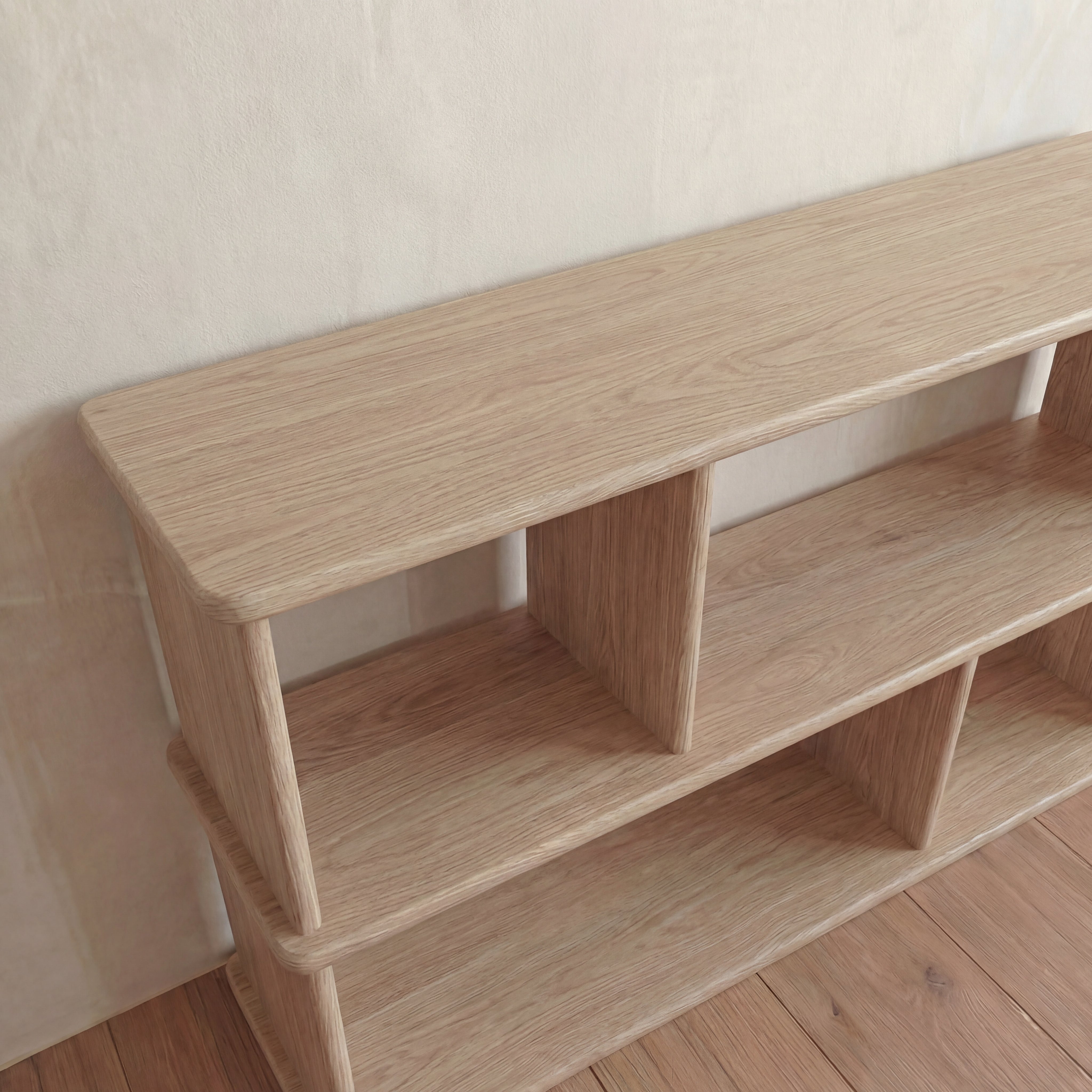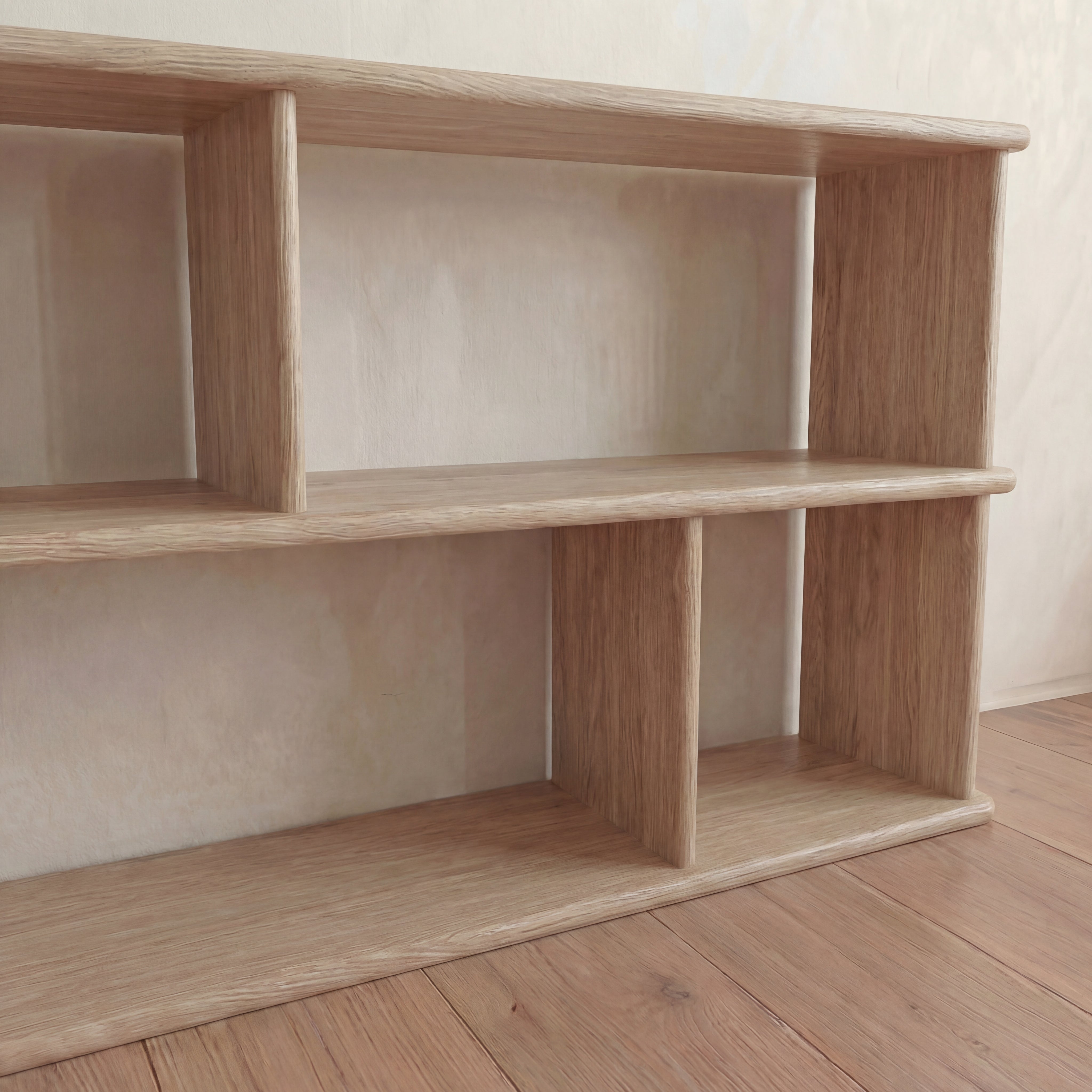 The horizontal bookshelf is made entirely out of solid, kiln dried white oak, finished with a non-toxic hard wax oil to highlight the wood's natural colour and rounded over subtly to soften all of the edges.