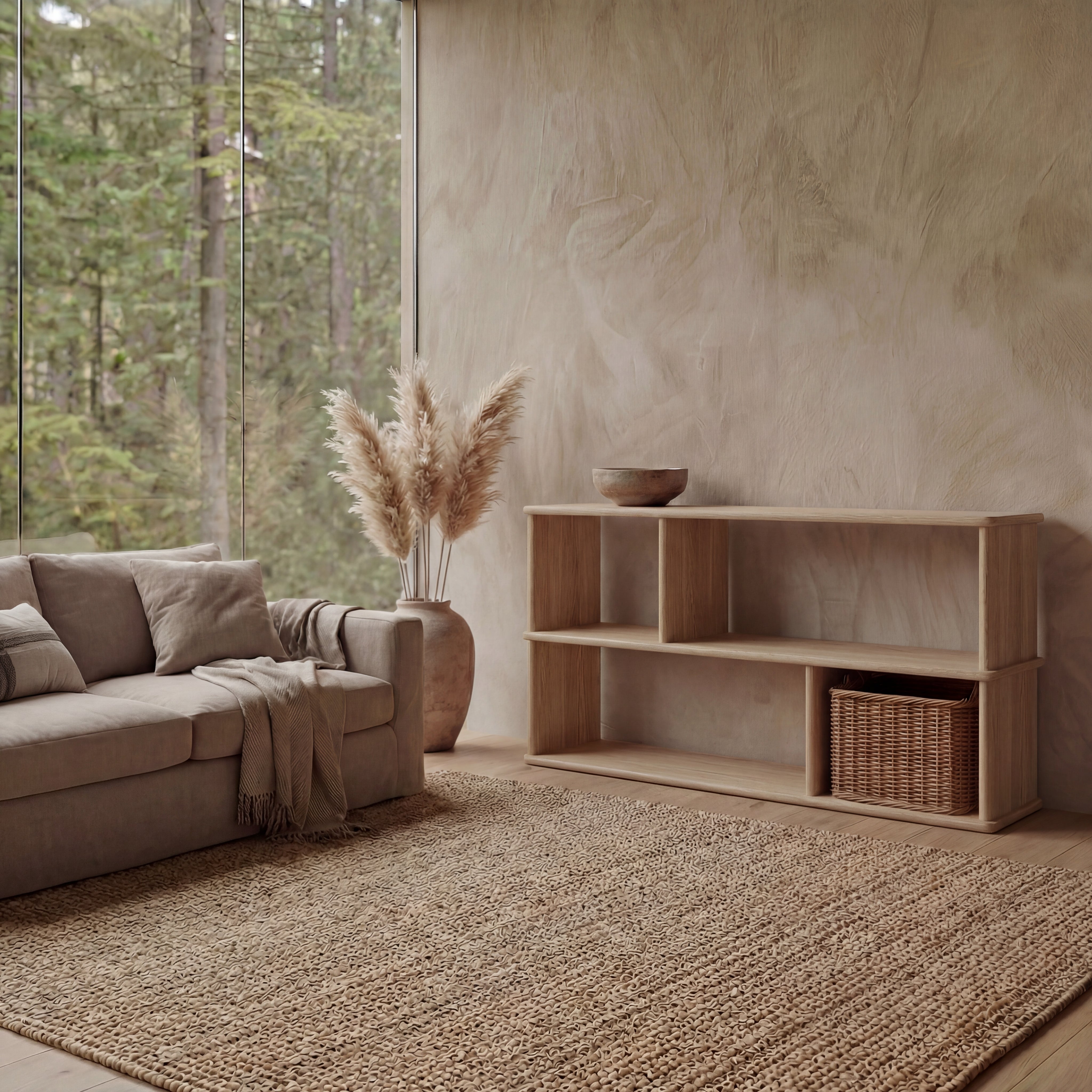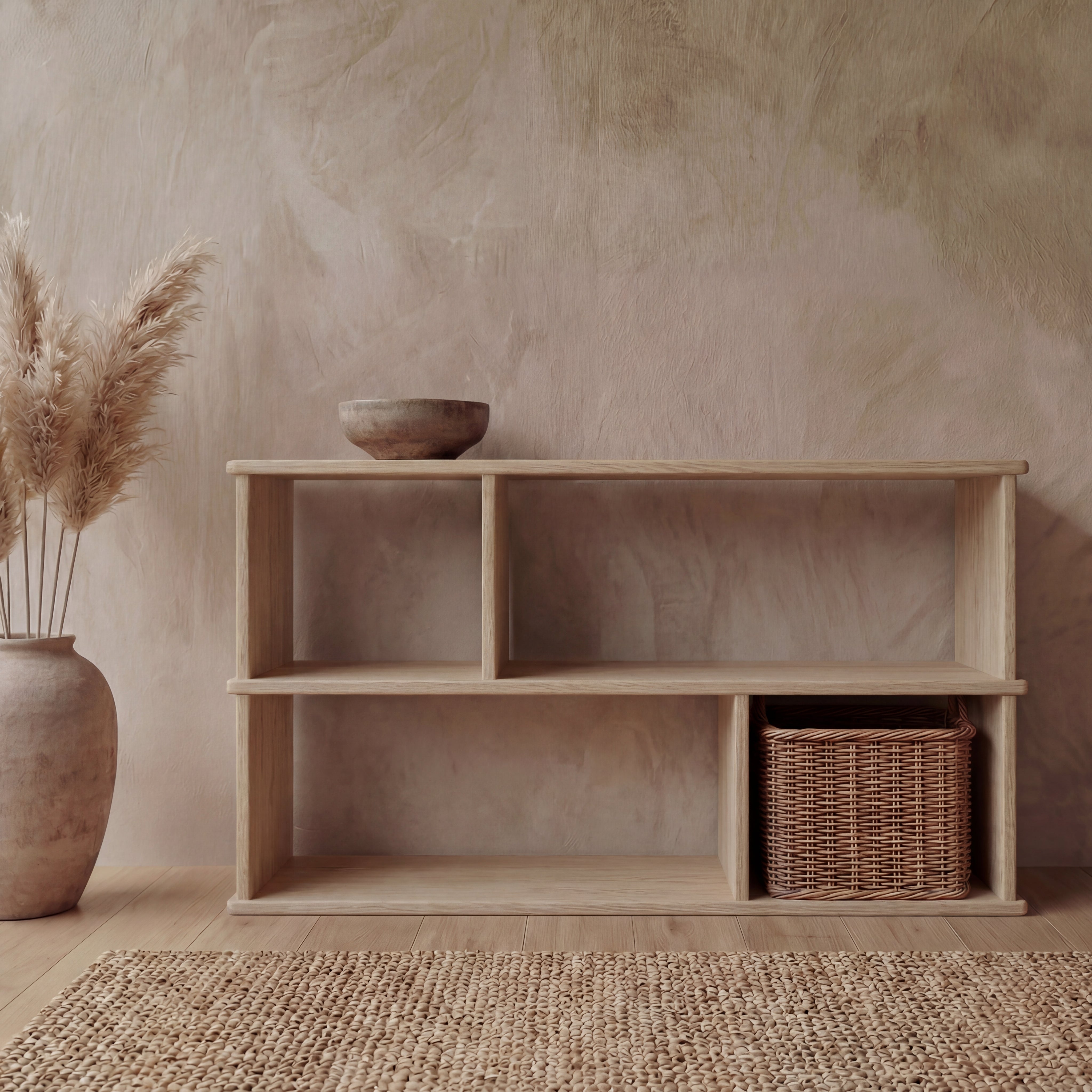 A low horizontal bookshelf in solid white oak, built by hand in Vancouver, BC