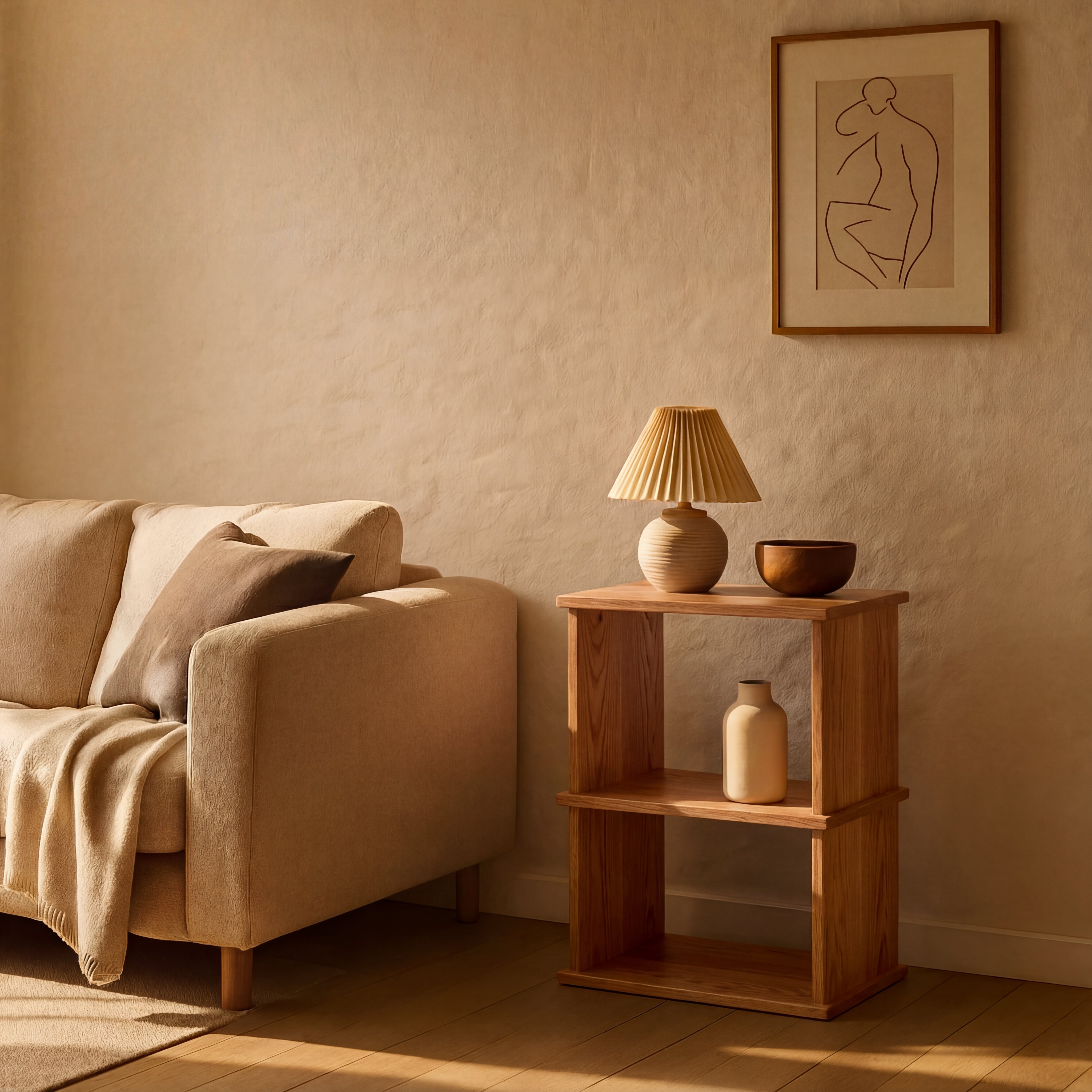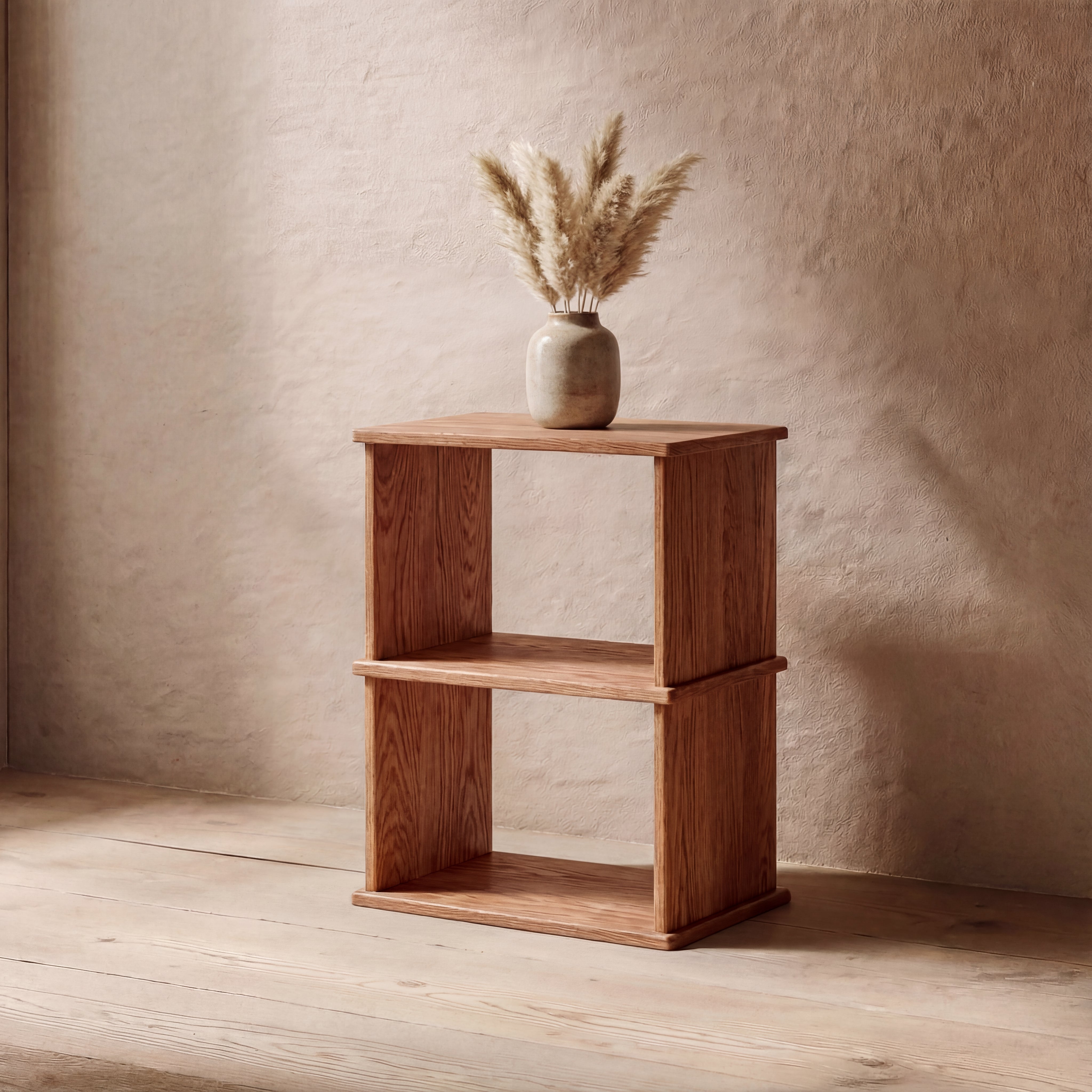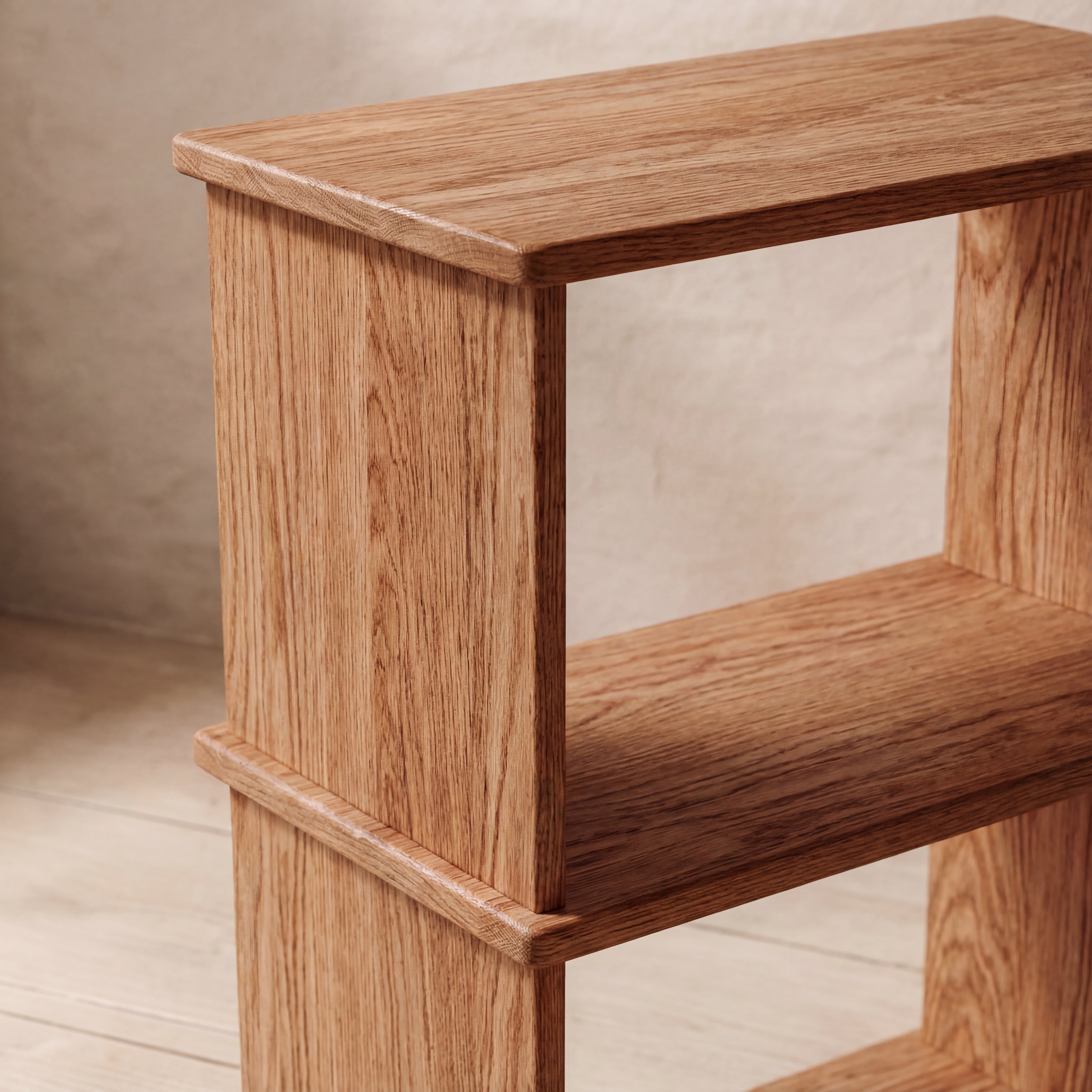 The nightstand bookshelf is made entirely out of solid, kiln dried red oak, finished with a non-toxic hard wax oil to highlight the wood's natural colour and rounded over subtly to soften all of the edges.