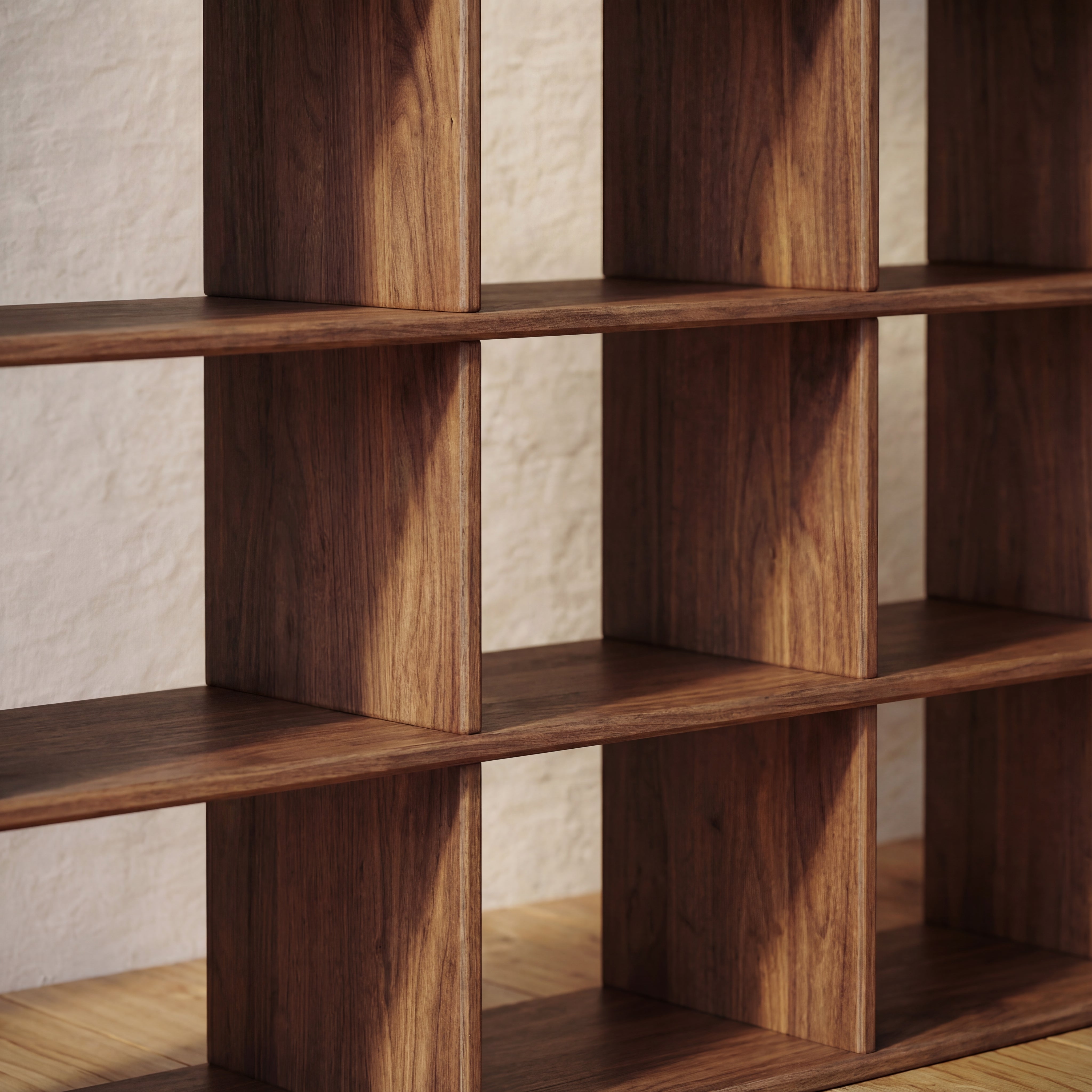 The nine cube bookshelf is made entirely out of solid, kiln dried walnut, finished with a non-toxic hard wax oil to highlight the wood's natural colour and rounded over subtly to soften all of the edges.