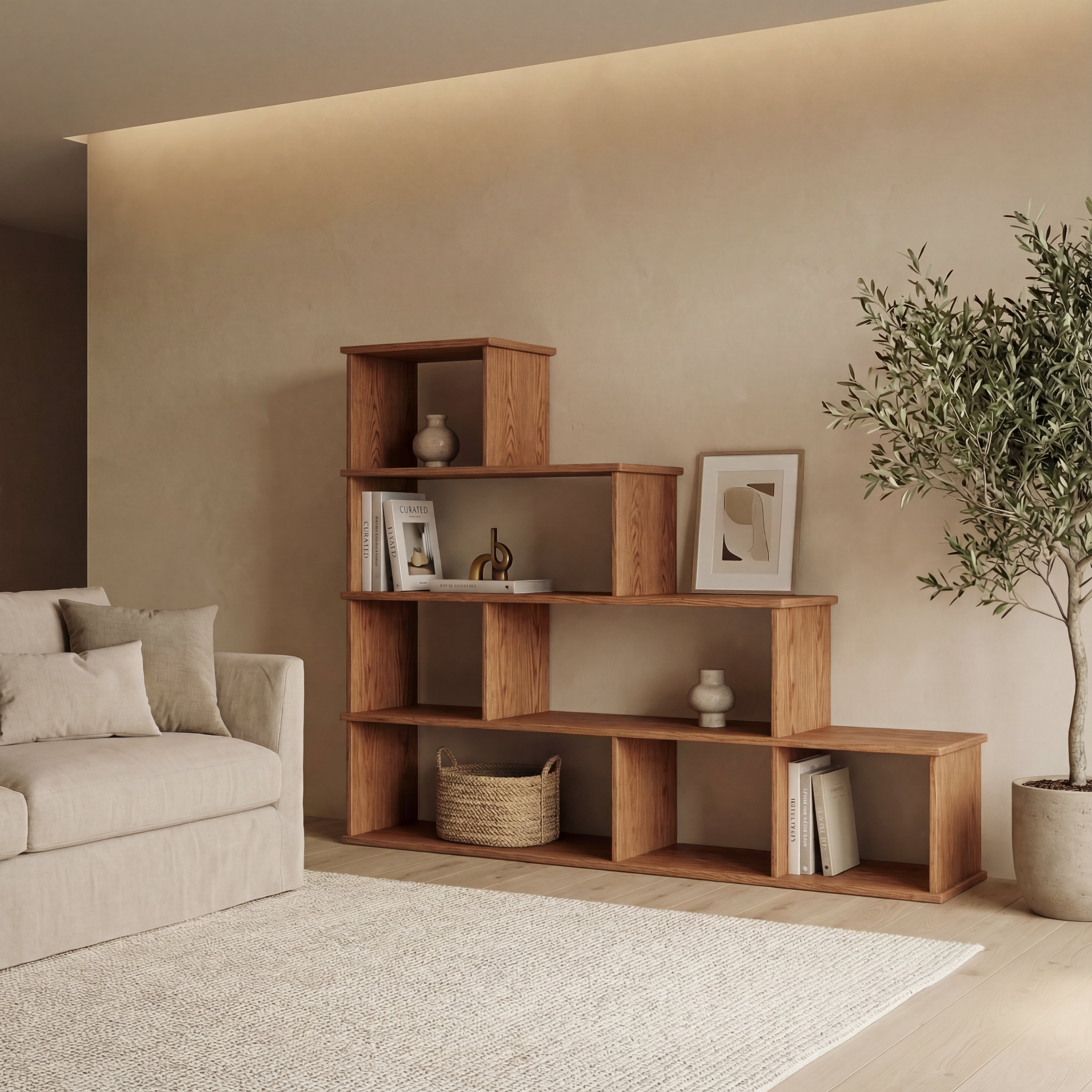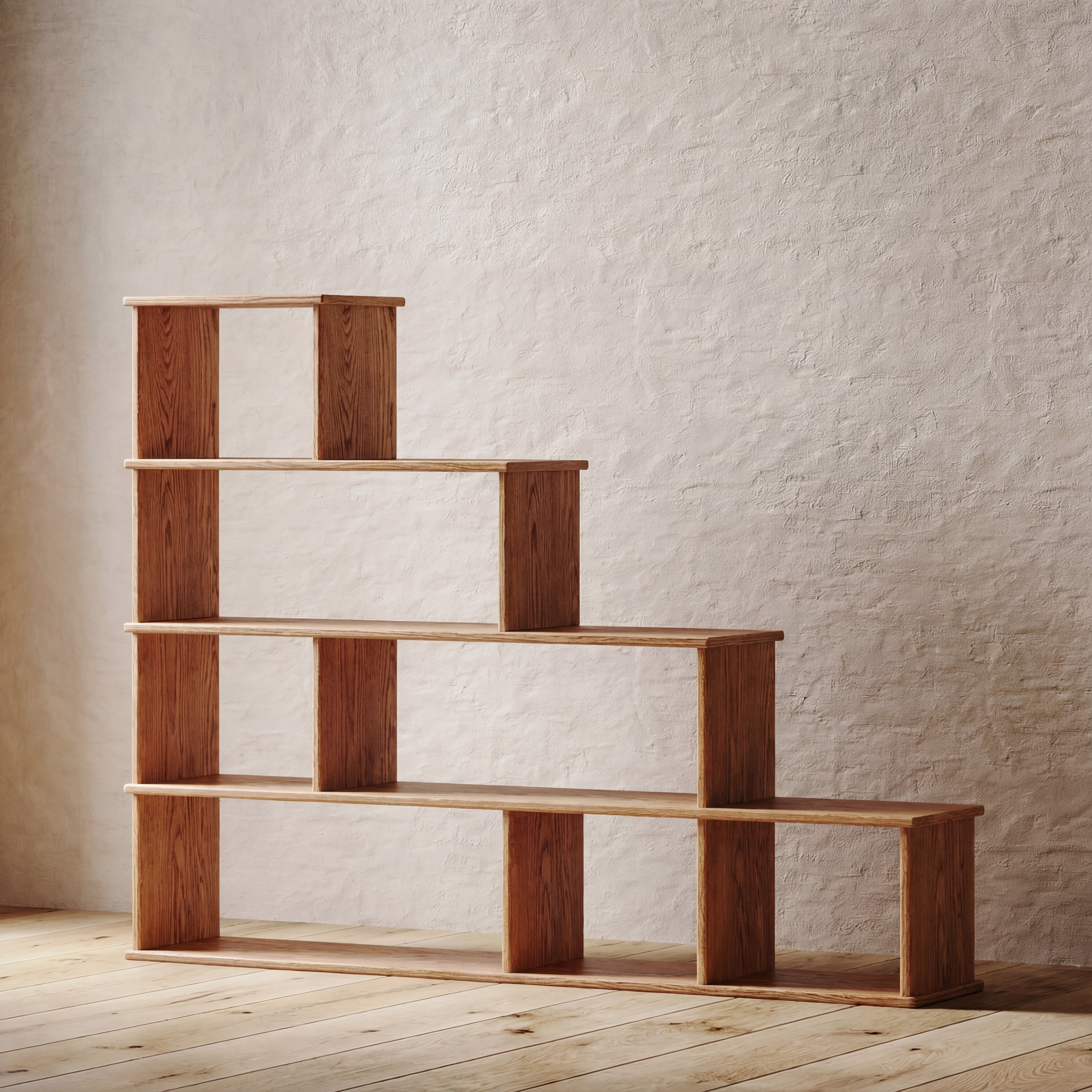 The step bookshelf is made entirely out of solid red oak, finished with a non-toxic hard wax oil to highlight the wood's natural colour and rounded over subtly to soften all of the edges.