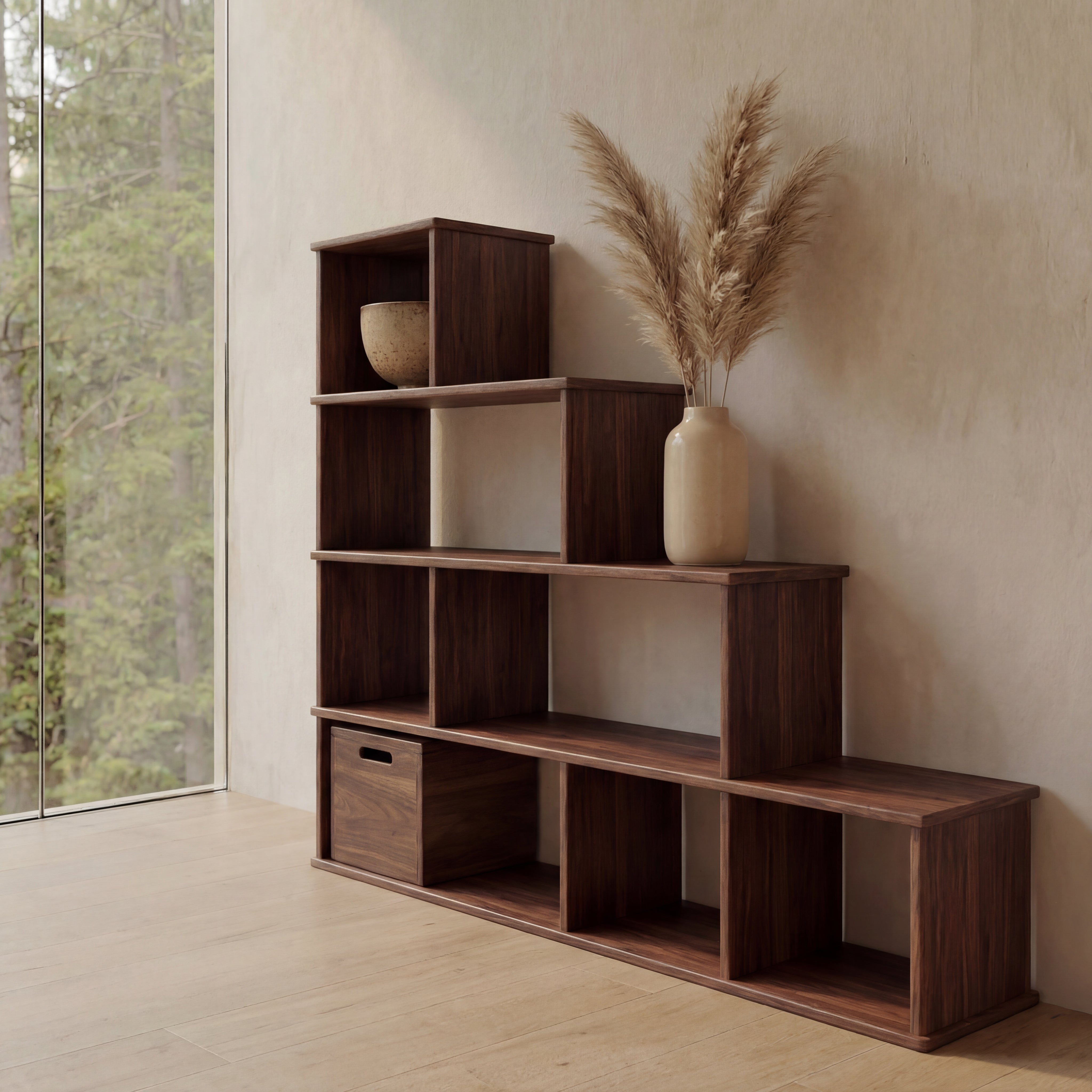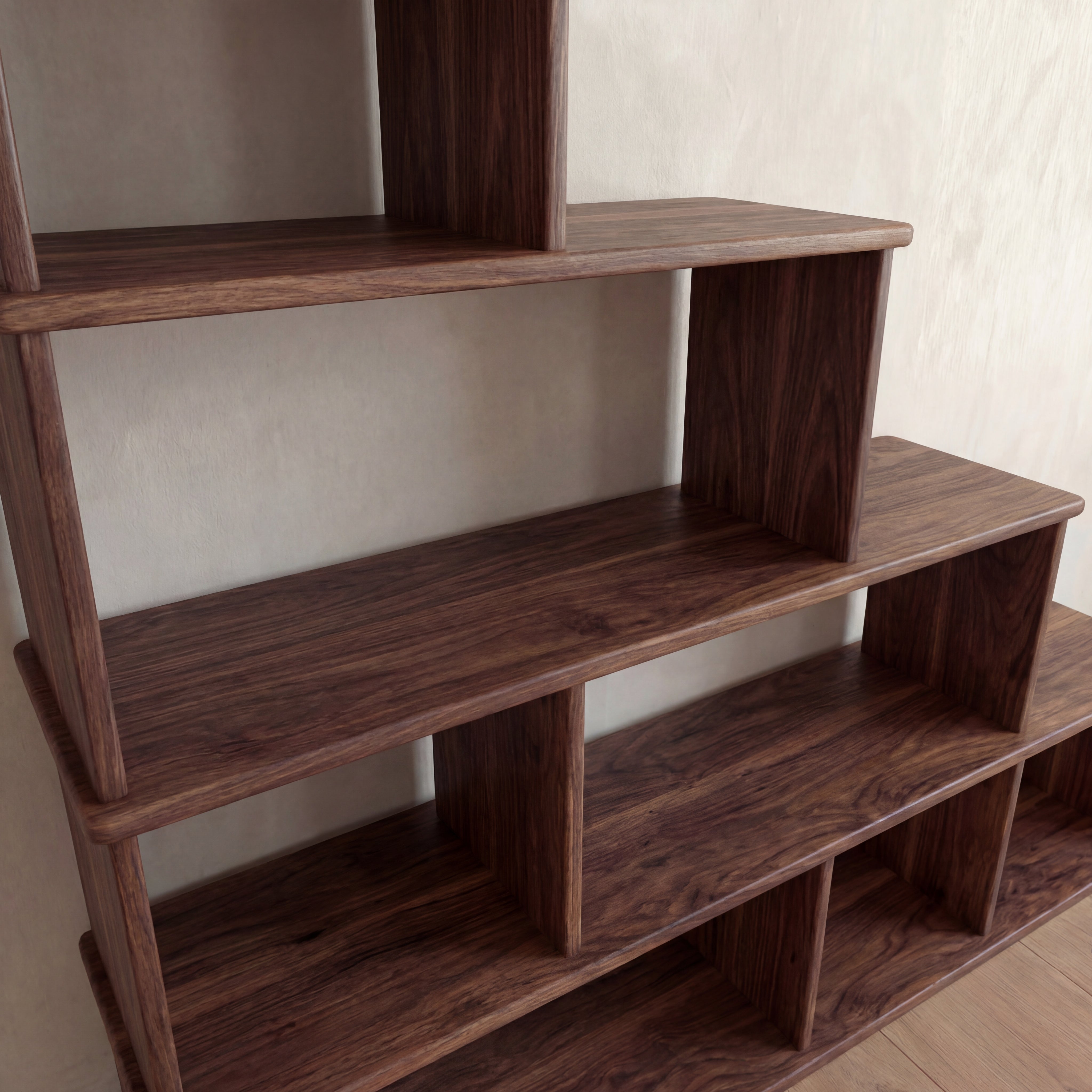 A step bookshelf in solid walnut, built by hand in Vancouver, BC