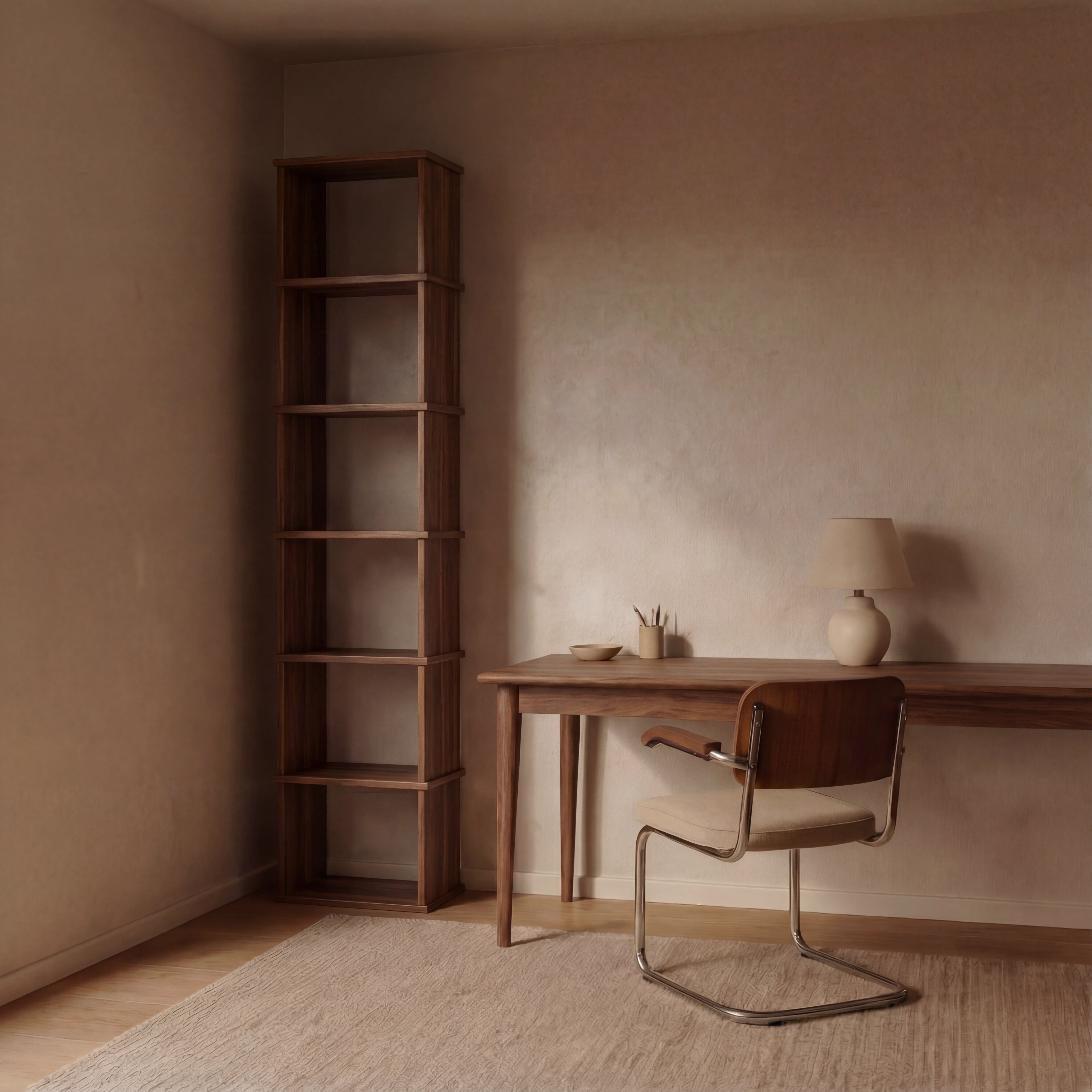The tall narrow bookcase is made entirely out of solid walnut, finished with a non-toxic hard wax oil to highlight the wood's natural colour and rounded over subtly to soften all of the edges.