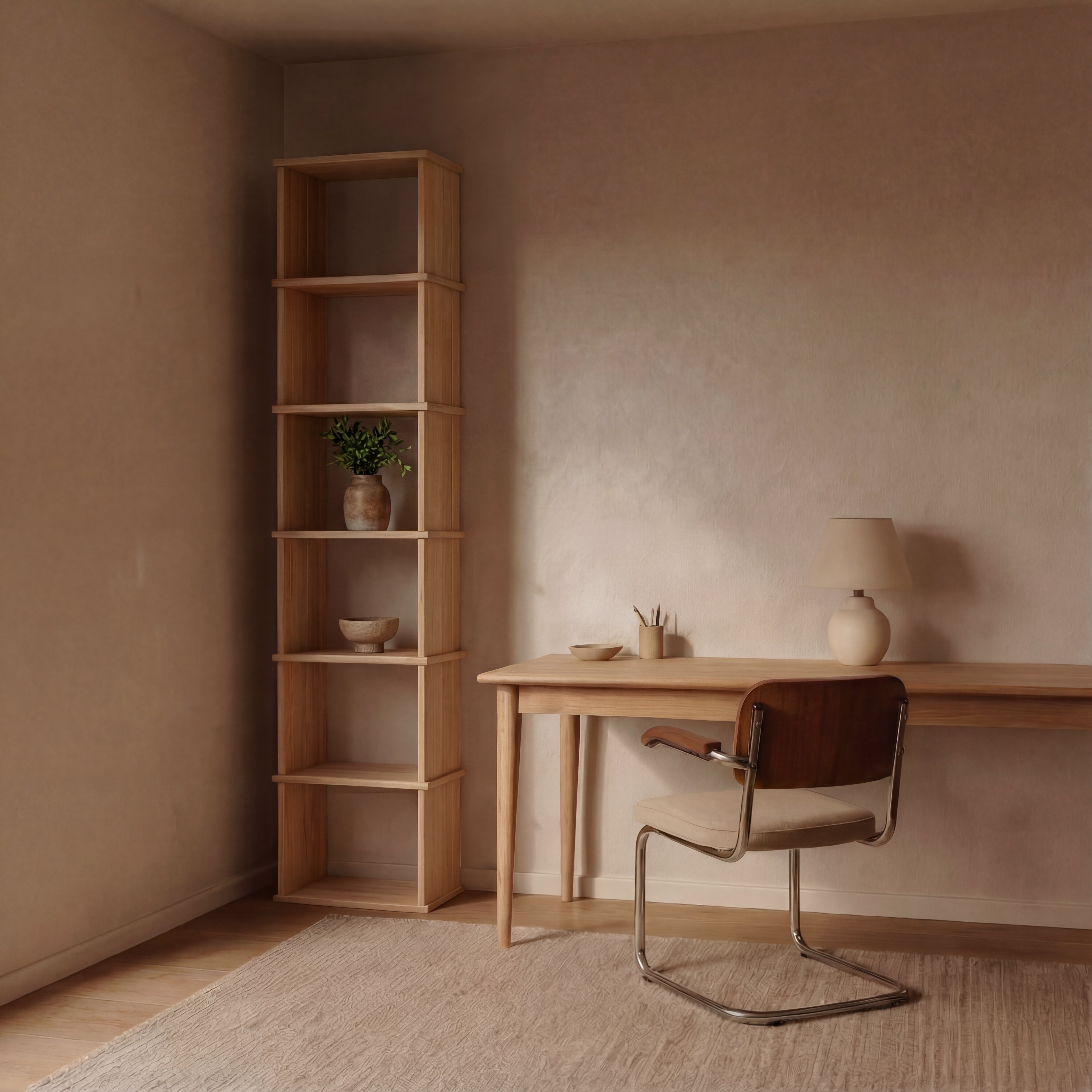 The tall narrow bookcase is made entirely out of solid white oak, finished with a non-toxic hard wax oil to highlight the wood's natural colour and rounded over subtly to soften all of the edges.